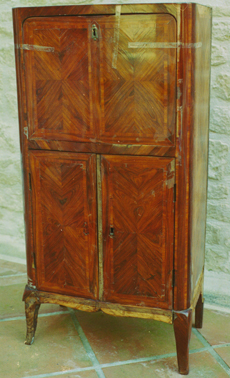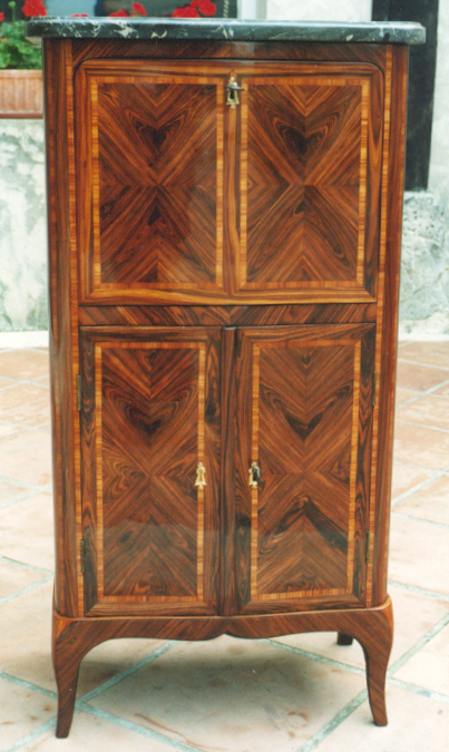 Ce secrétaire de dame d’époque Louis XVI plaqué de bois de violette avec frisages en ailes de papillon et de filets de bois de rose en travers fils est l’œuvre de l’ébéniste parisien Denis Genty.