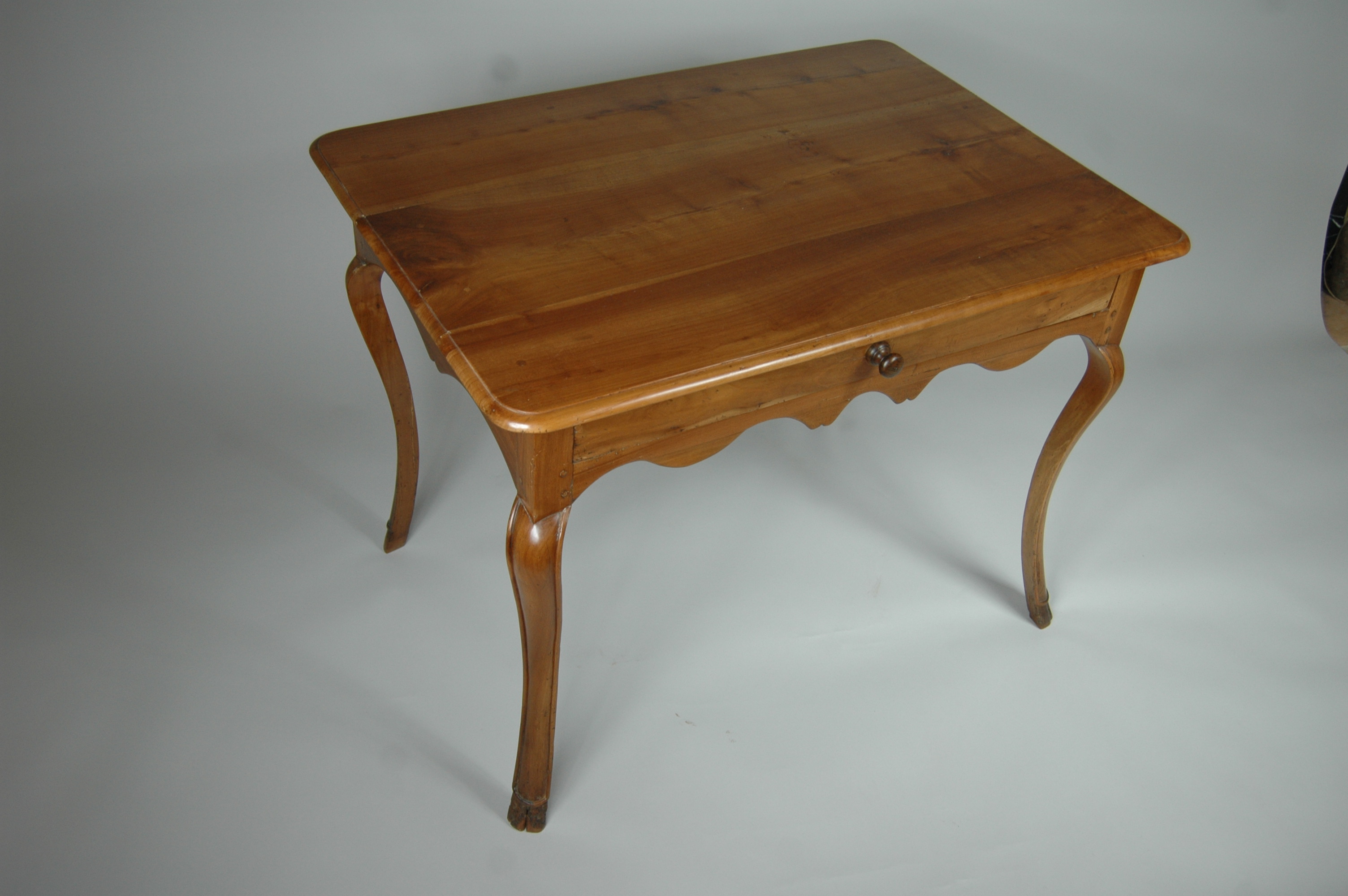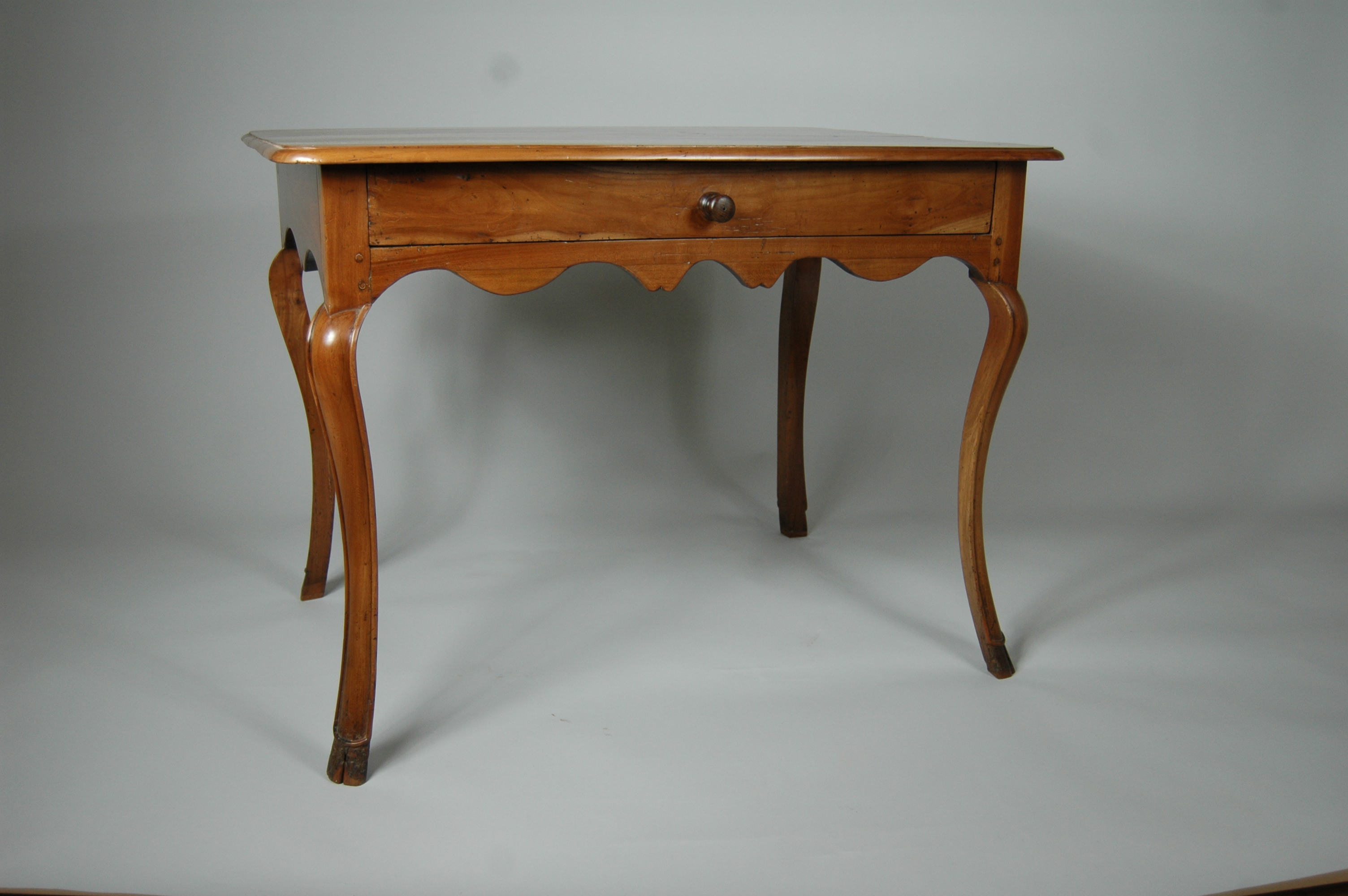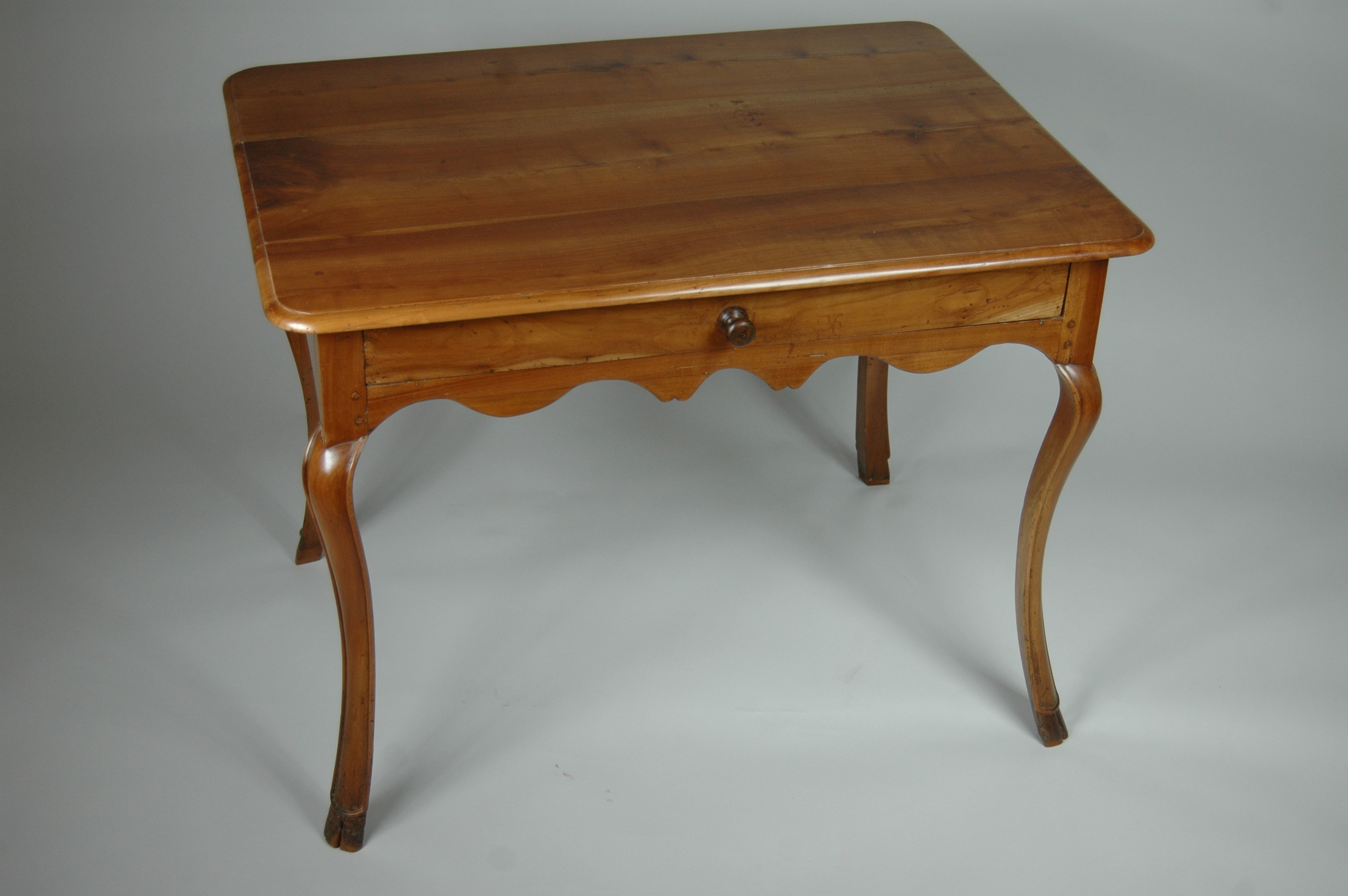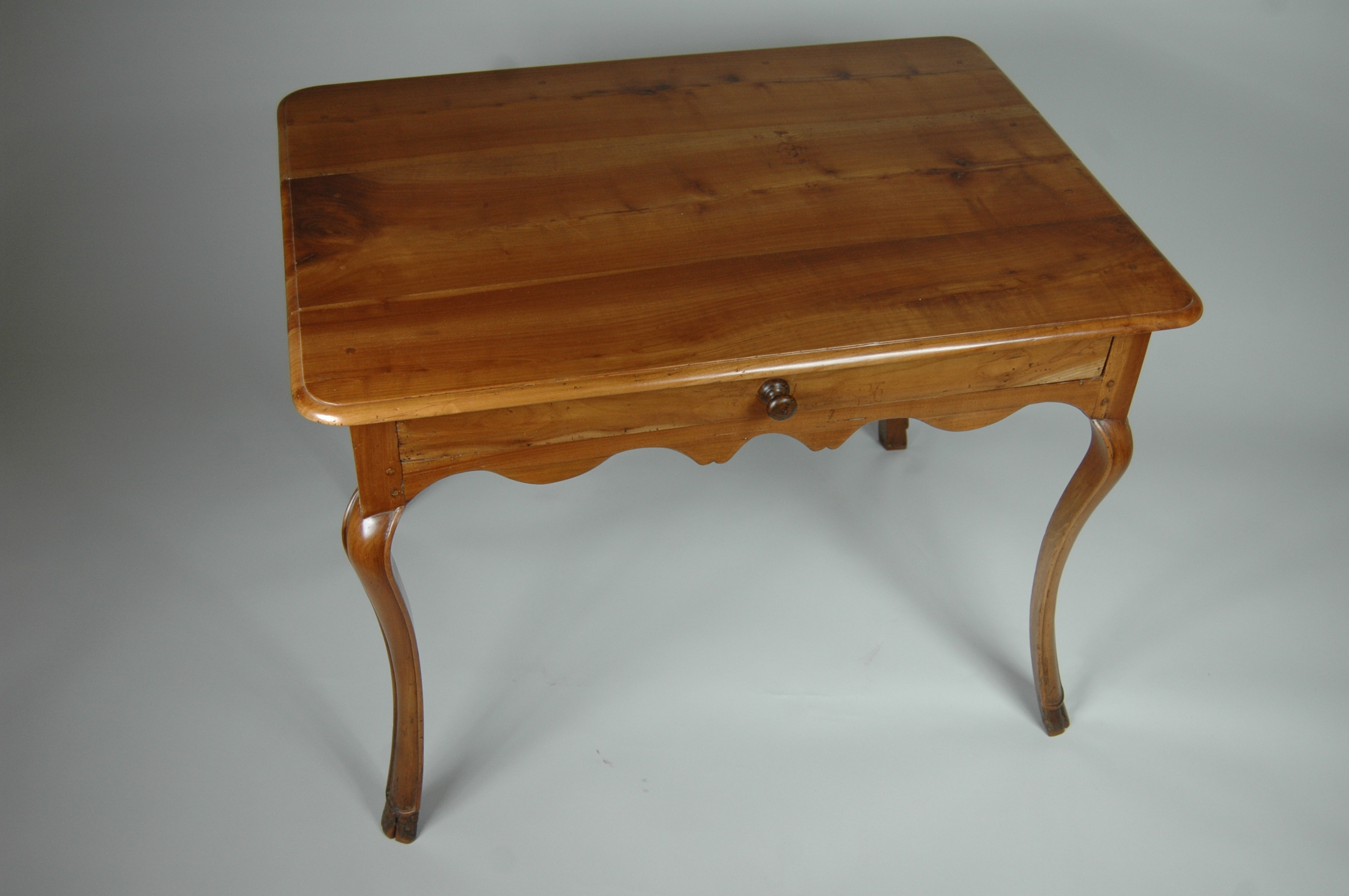 Table d'appoint Louis XV en merisier Table d'appoint Louis XV en merisier aux pieds largement cambrés. Pièces réalisées sur les traverses et les bouts de pieds, changement des coulisseaux de tiroir, réalésage des côtés. Les fonçures de tiroir sont en peuplier. Deuxième moitié du XVIIIe siècle. Fabrication des environs de La Rochelle. H: 66 - L : 88 – P:63,5 cm Prix : 1.600,00 € |