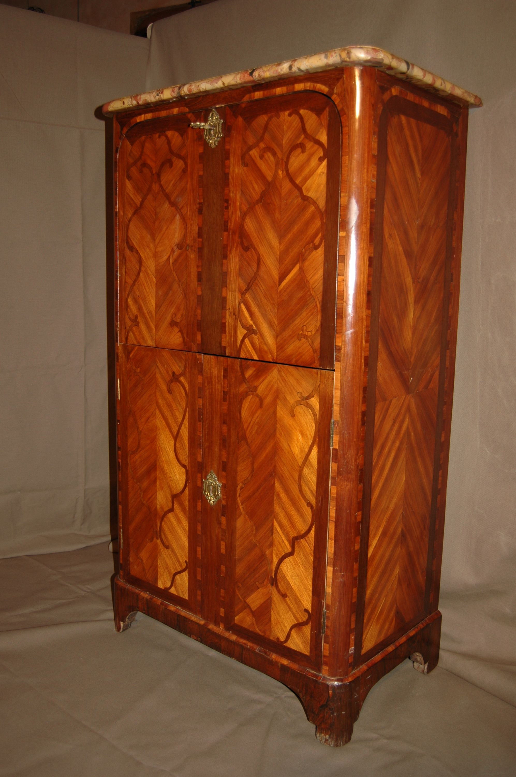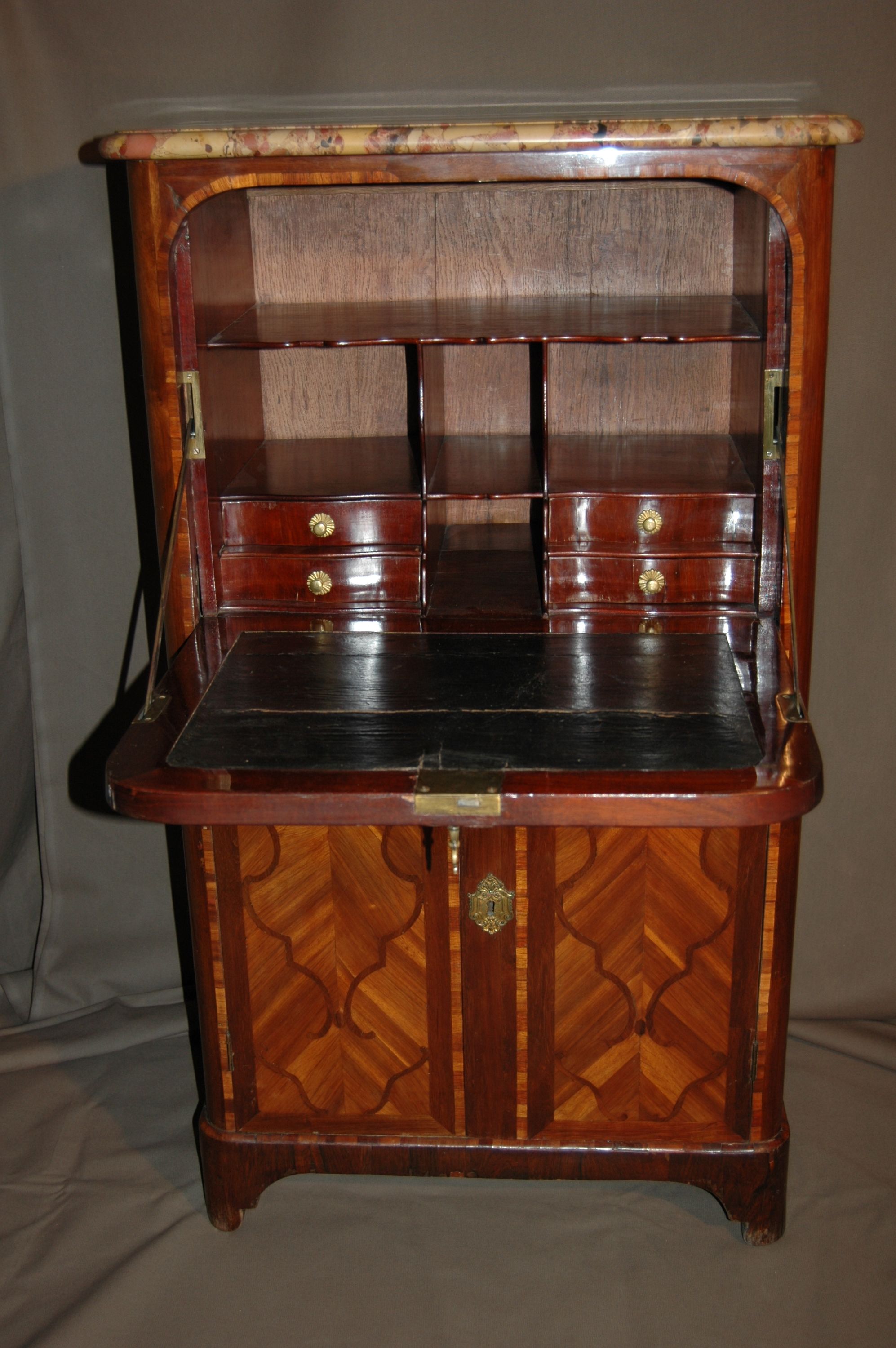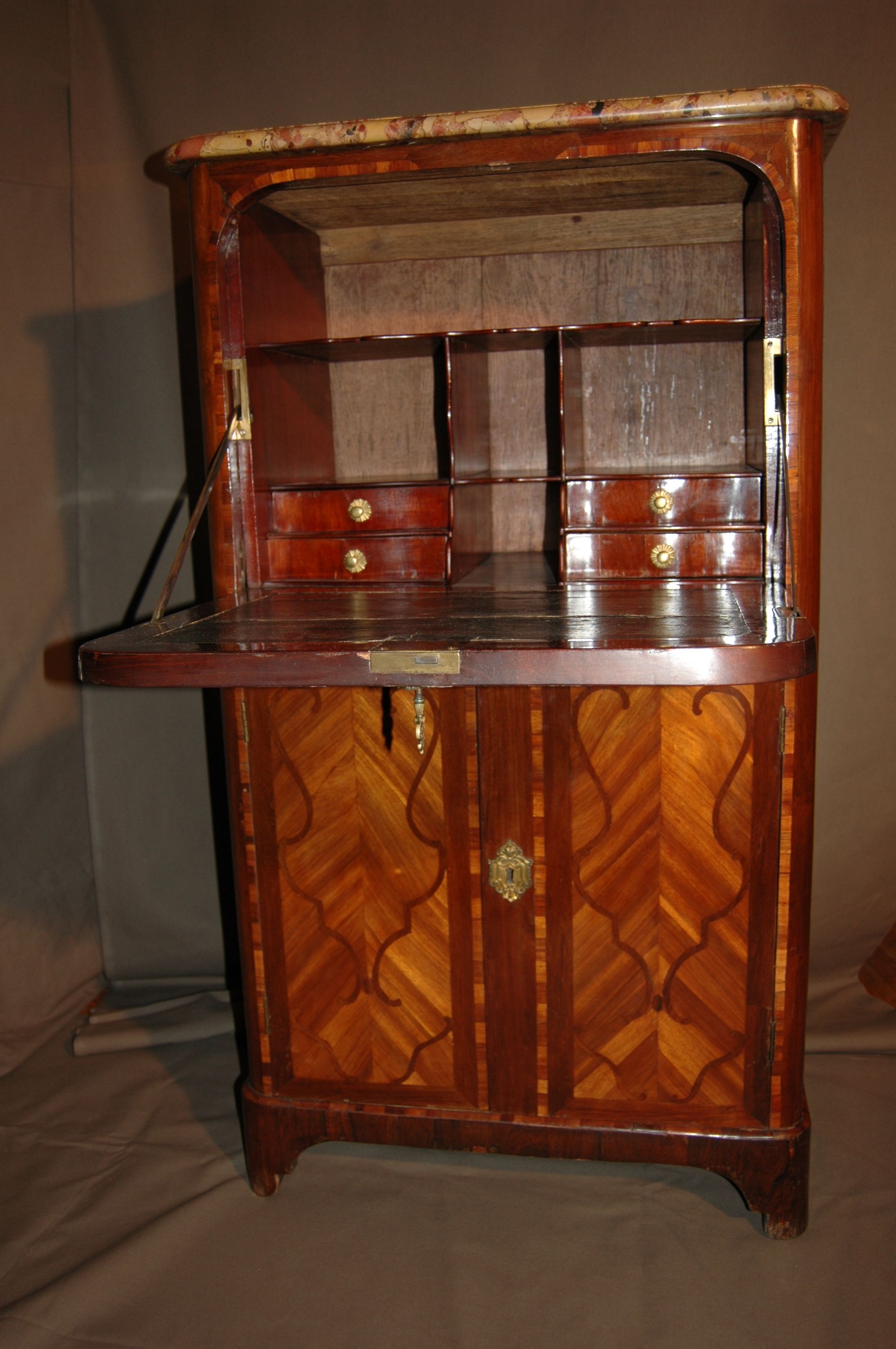 Secrétaire de dame Louis XV plaqué de frisage de satiné marqueté d'arabesques et d'encadrement d'amarante. Il ouvre par un abattant et deux portes masquant la traverse médiane. L'ouverture de l'abattant laisse apparaître un intérieur de plaquettes délicatement chantournées qui soutiennent quatre tiroirs galbés. Il est coiffé d'une brèche d'Alep.