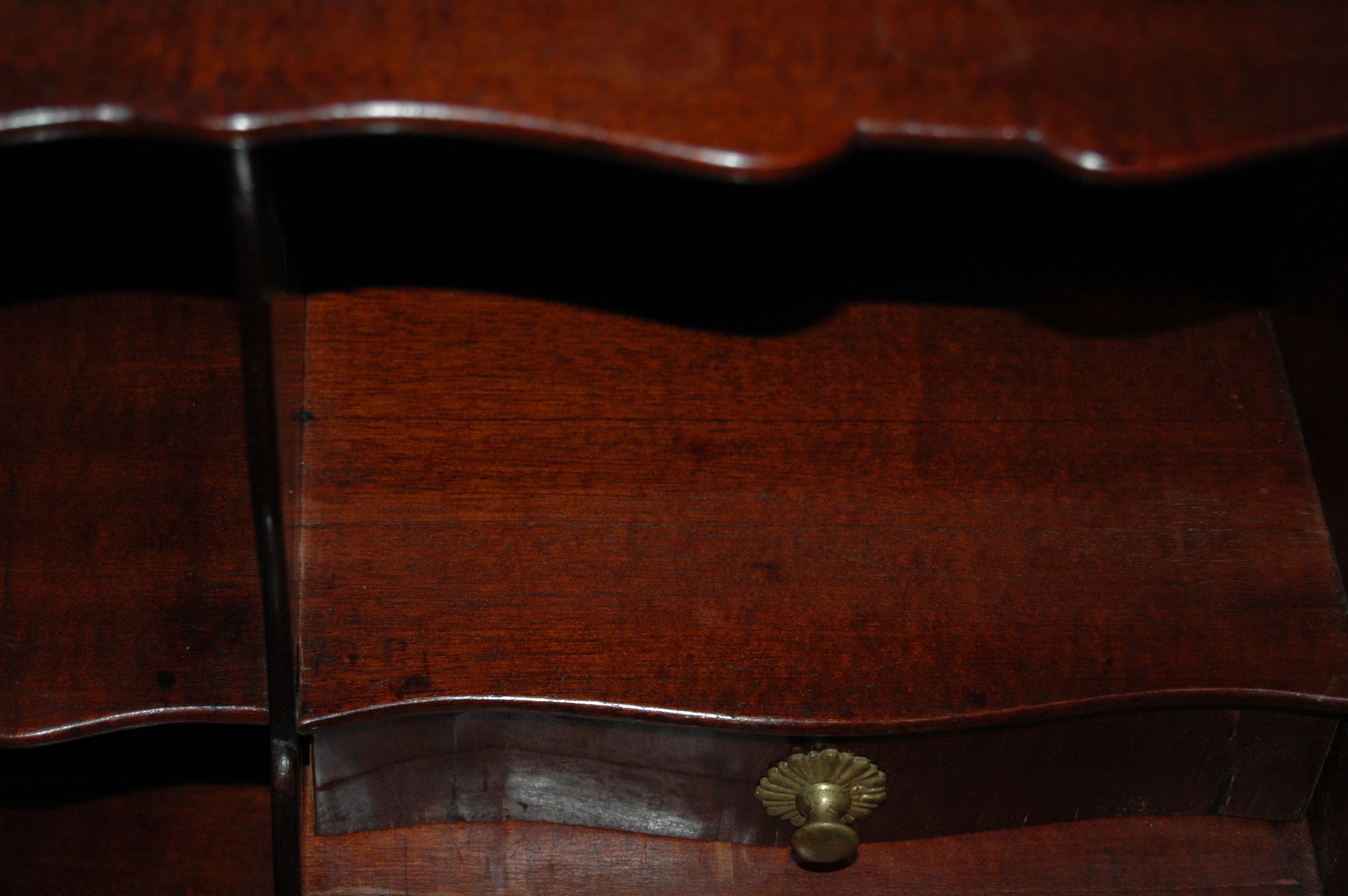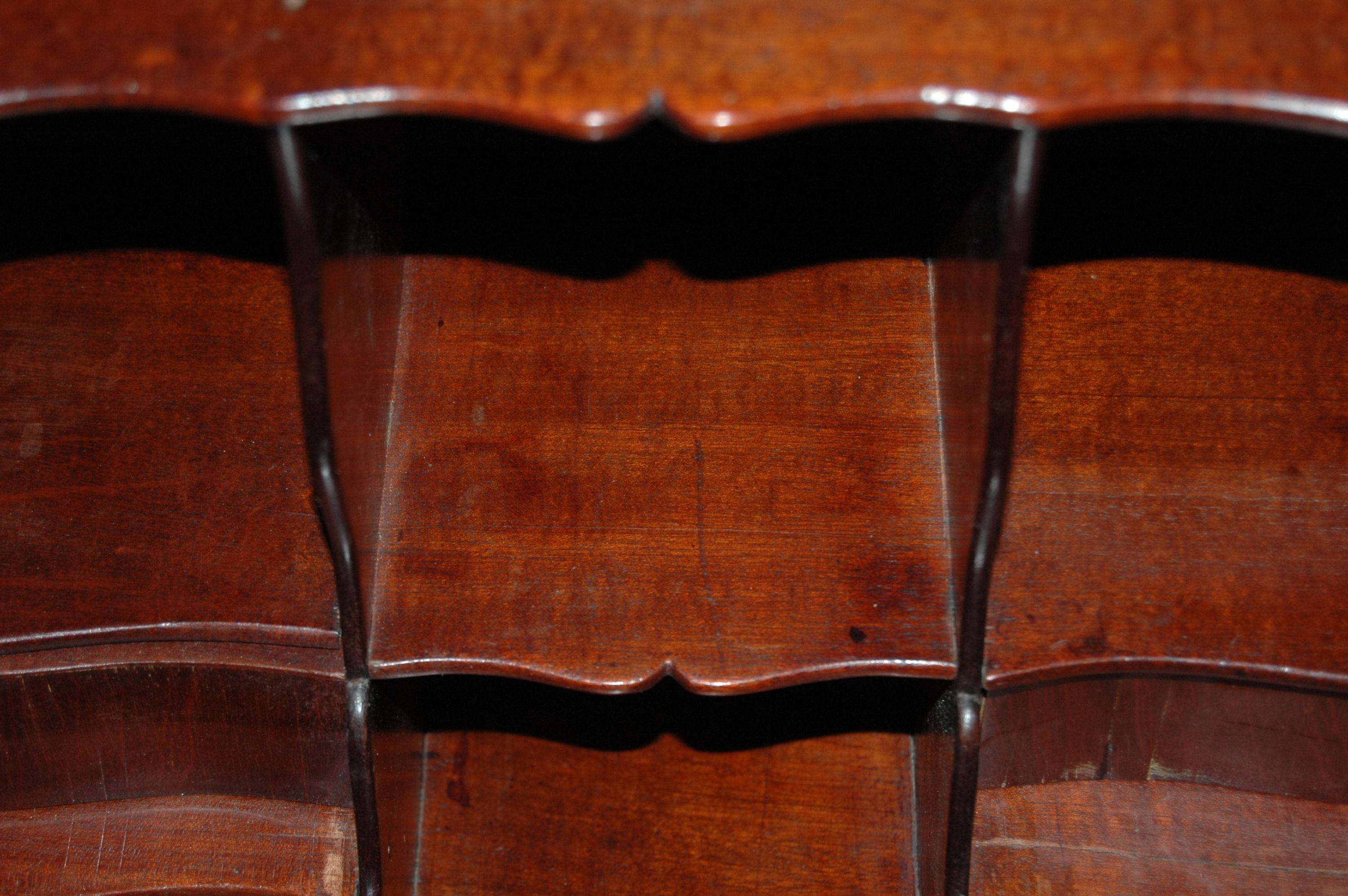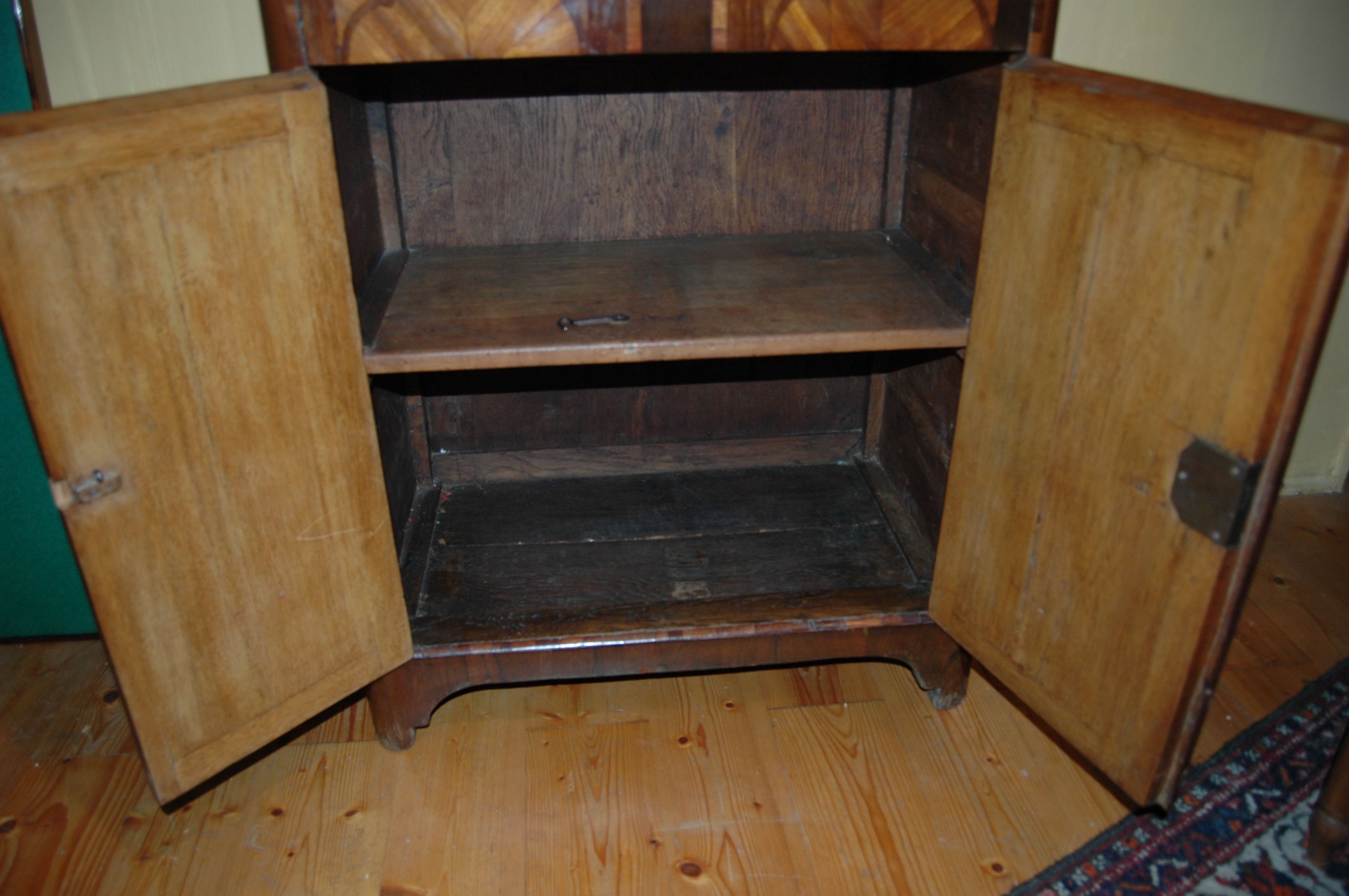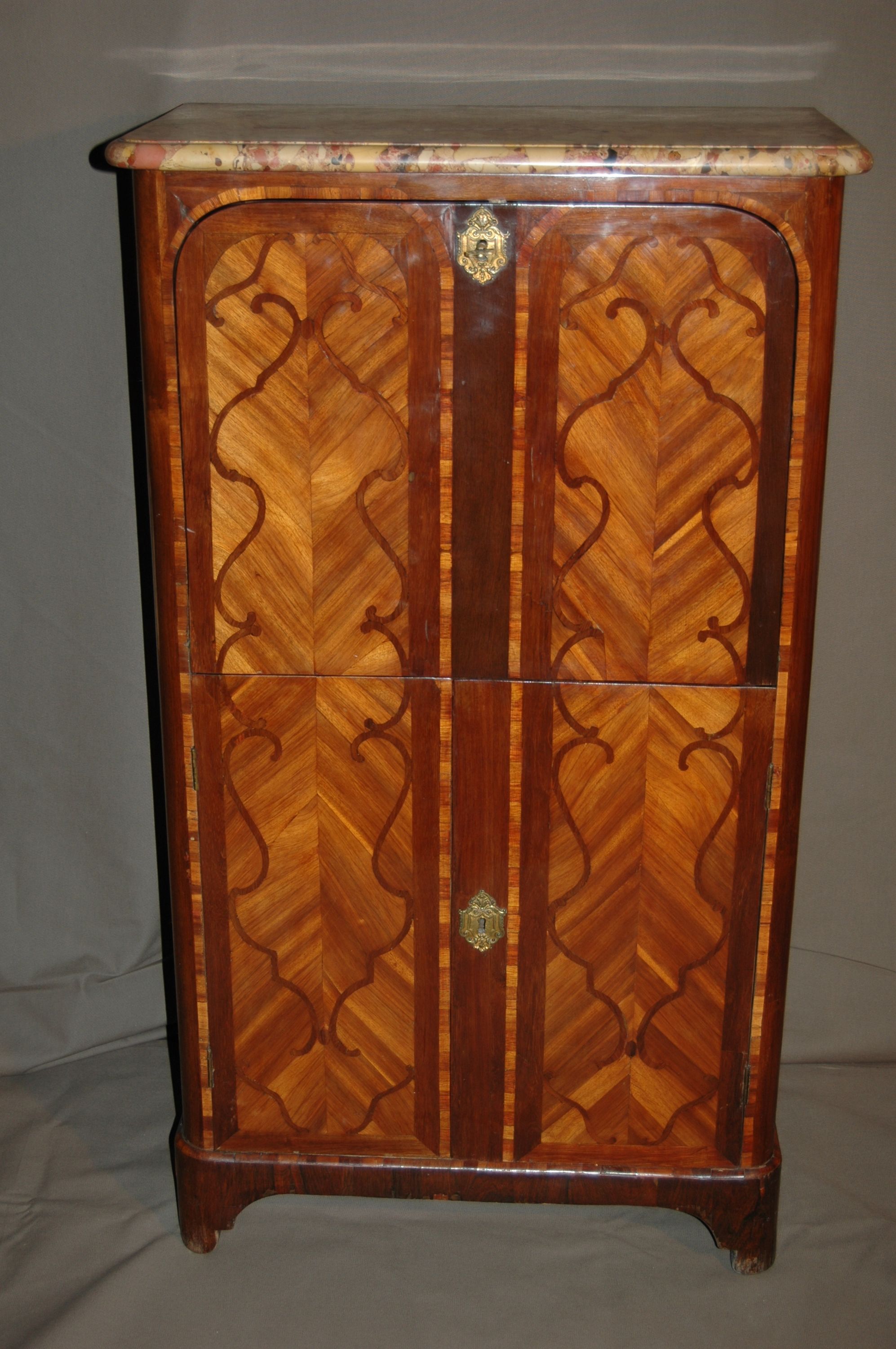 Secrétaire de dame Louis XV plaqué de frisage de satiné marqueté d'arabesques et d'encadrement d'amarante. Il ouvre par un abattant et deux portes masquant la traverse médiane. L'ouverture de l'abattant laisse apparaître un intérieur de plaquettes délicatement chantournées qui soutiennent quatre tiroirs galbés. Il est coiffé d'une brèche d'Alep.