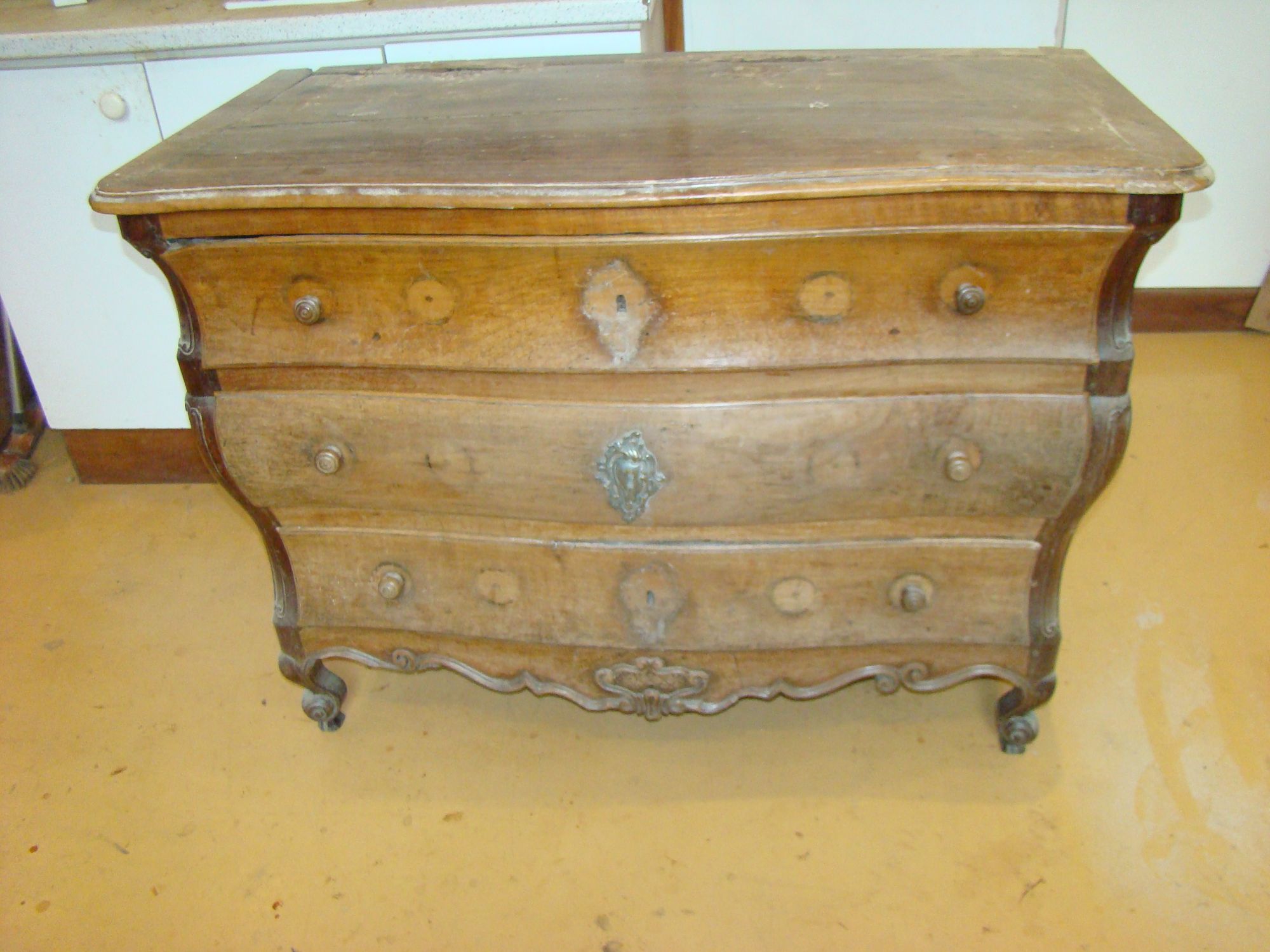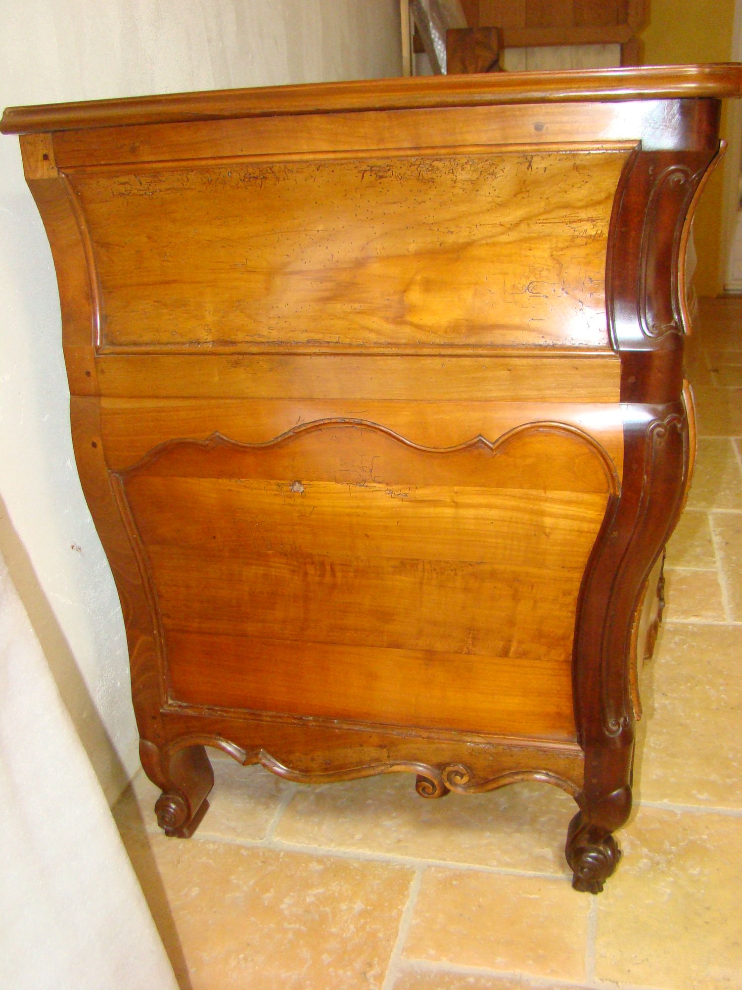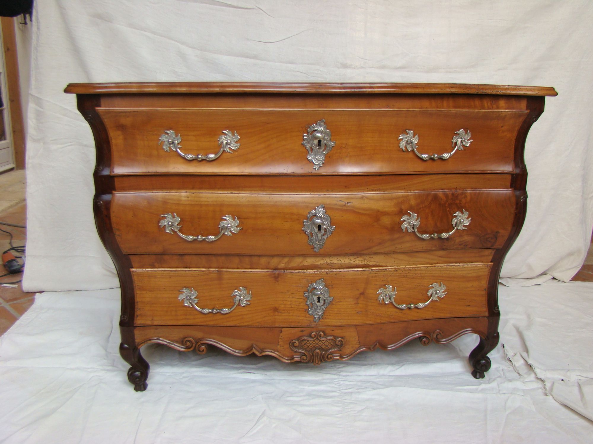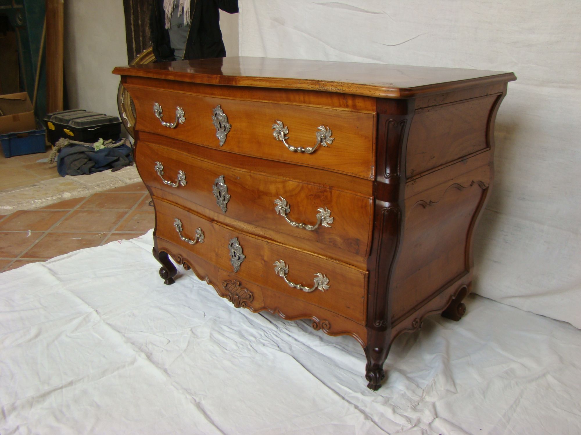 Restauration d'une commode Louis XV tombeau en merisier avec les montants avant en acajou ; des environs de La Rochelle. Cette commode, ayant séjourné dans une maison infestée de termites, a subi de nombreux dommages.