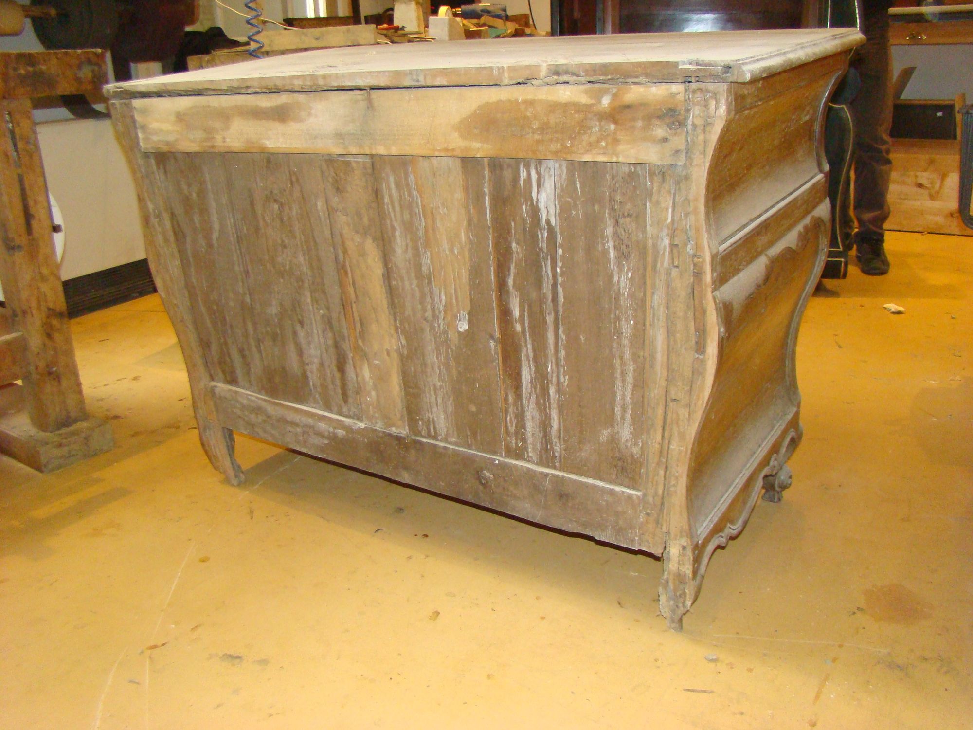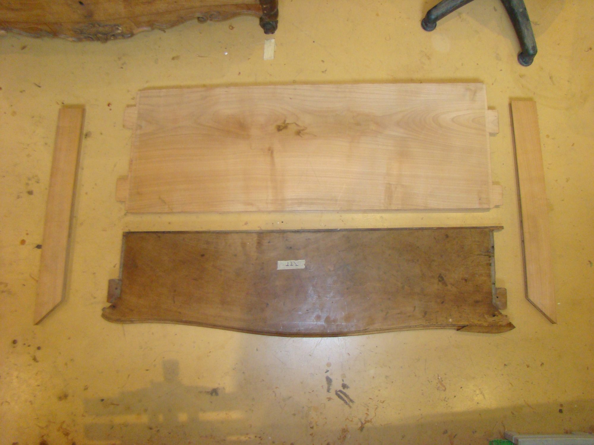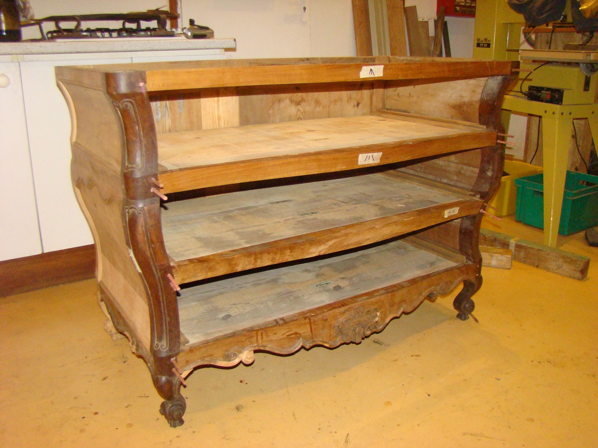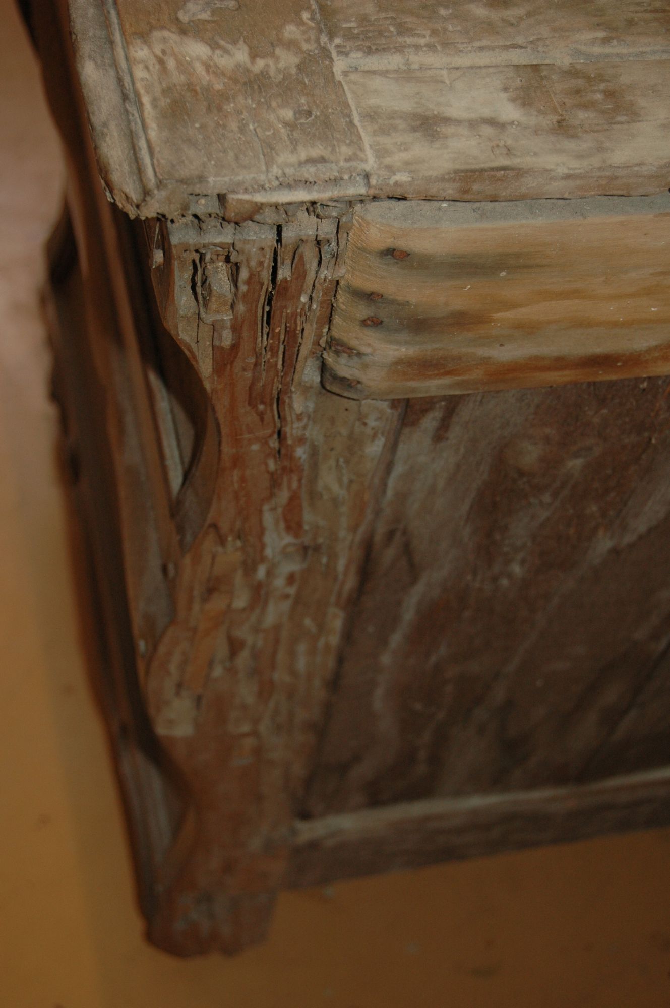 Restauration d'une commode Louis XV tombeau en merisier avec les montants avant en acajou ; des environs de La Rochelle. Cette commode, ayant séjourné dans une maison infestée de termites, a subi de nombreux dommages.