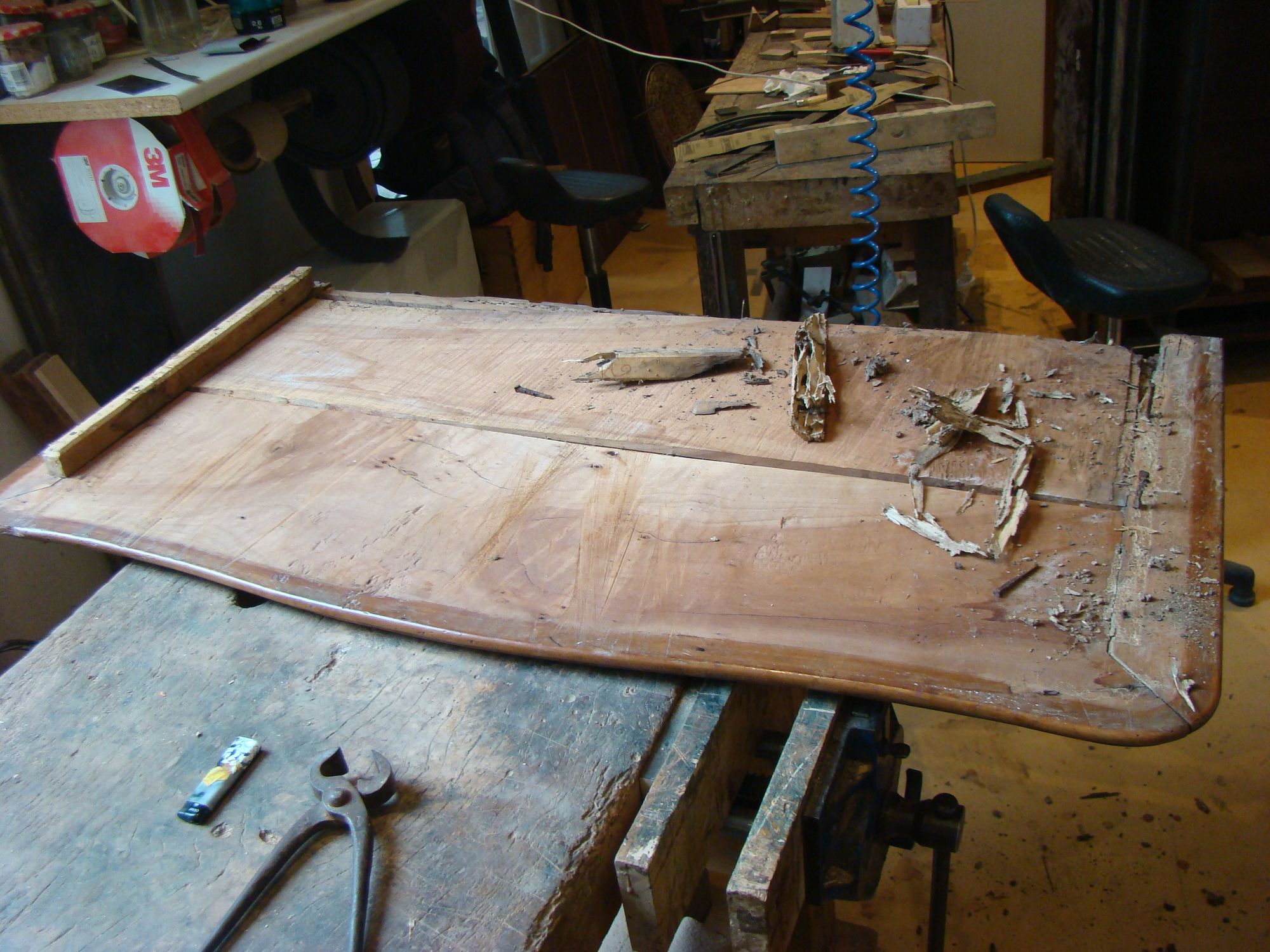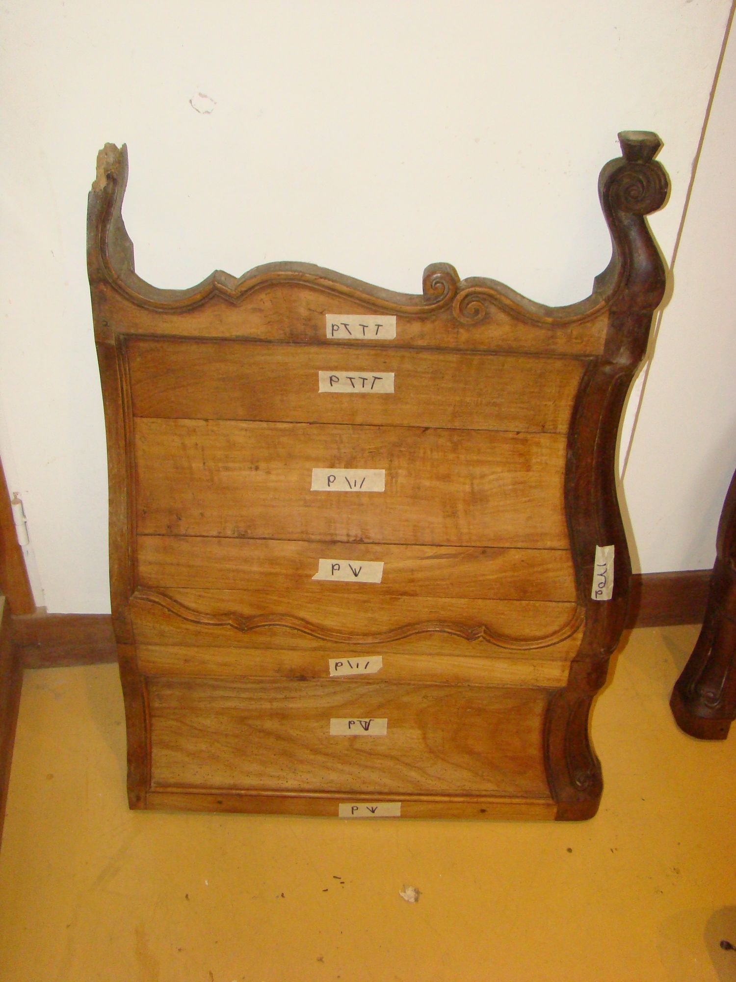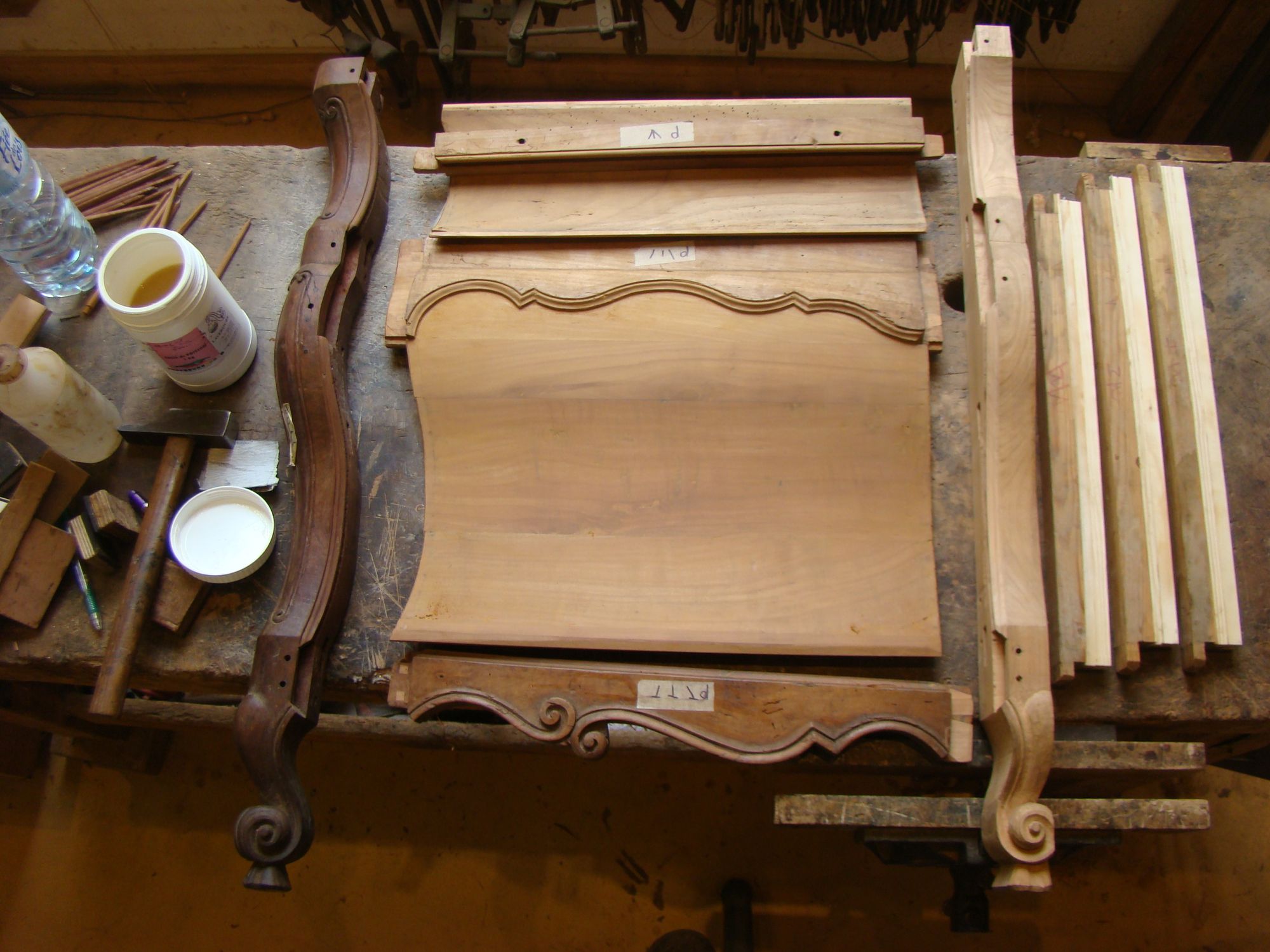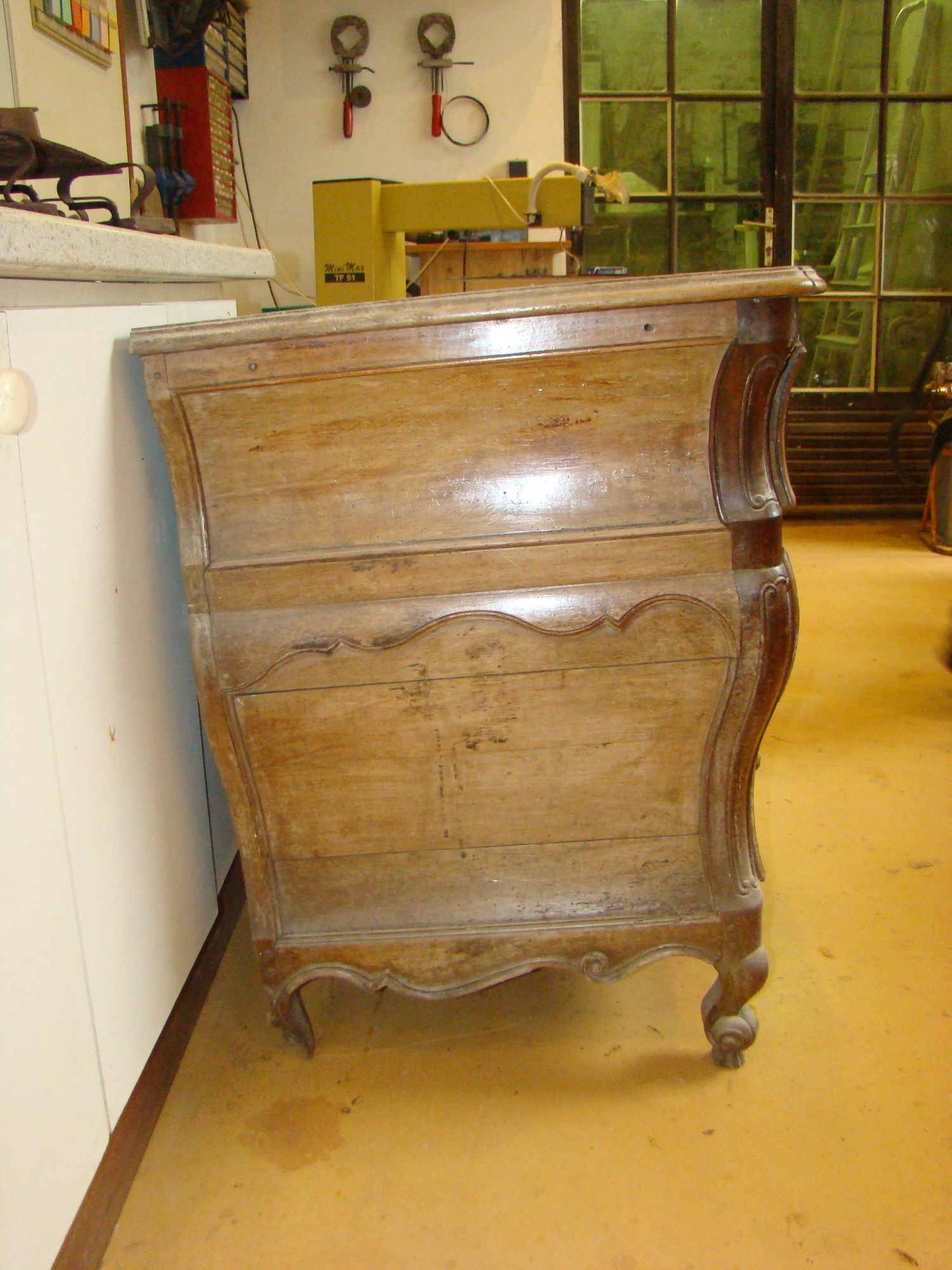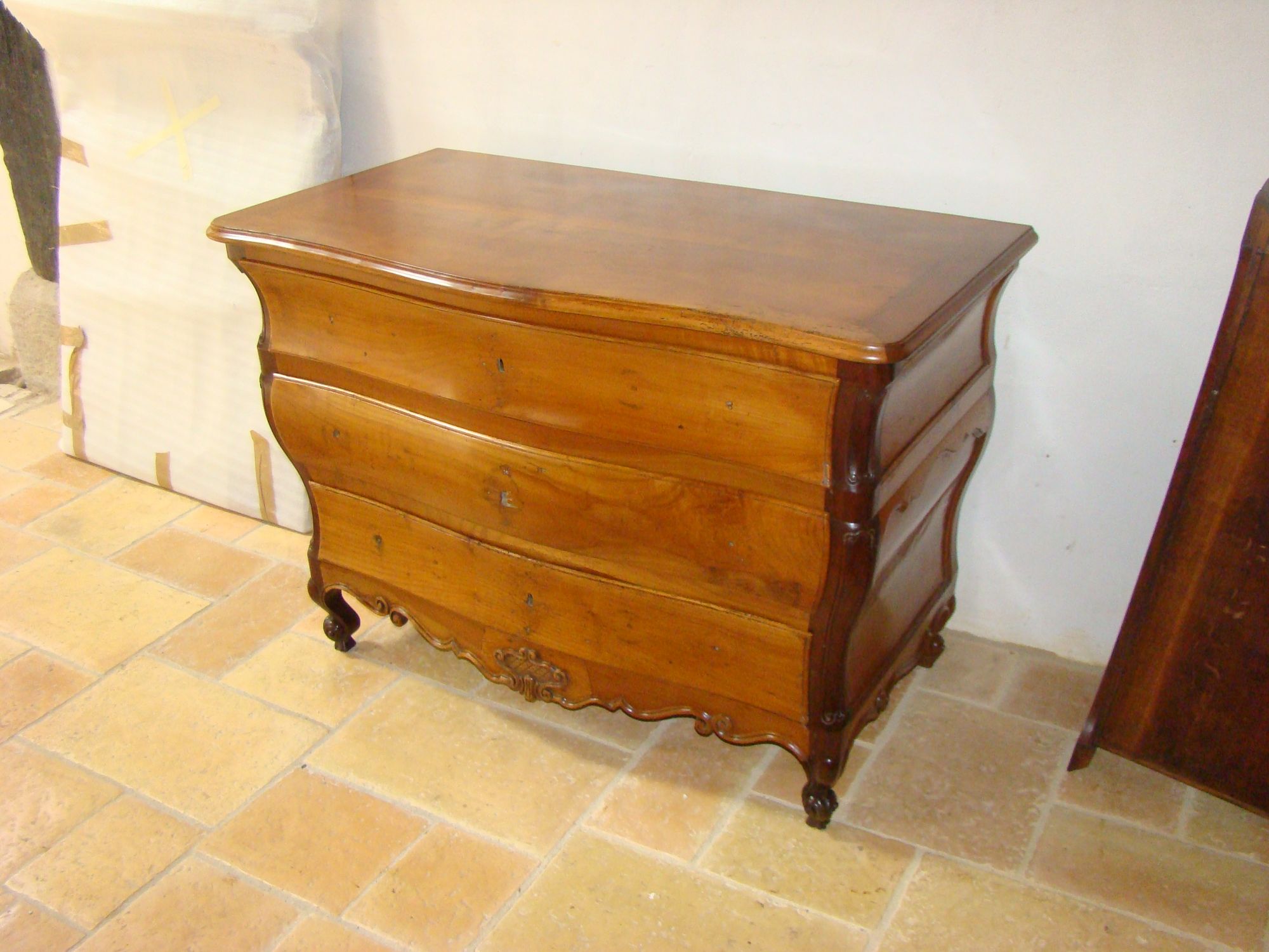 Restauration d'une commode Louis XV tombeau en merisier avec les montants avant en acajou ; des environs de La Rochelle. Cette commode, ayant séjourné dans une maison infestée de termites, a subi de nombreux dommages.