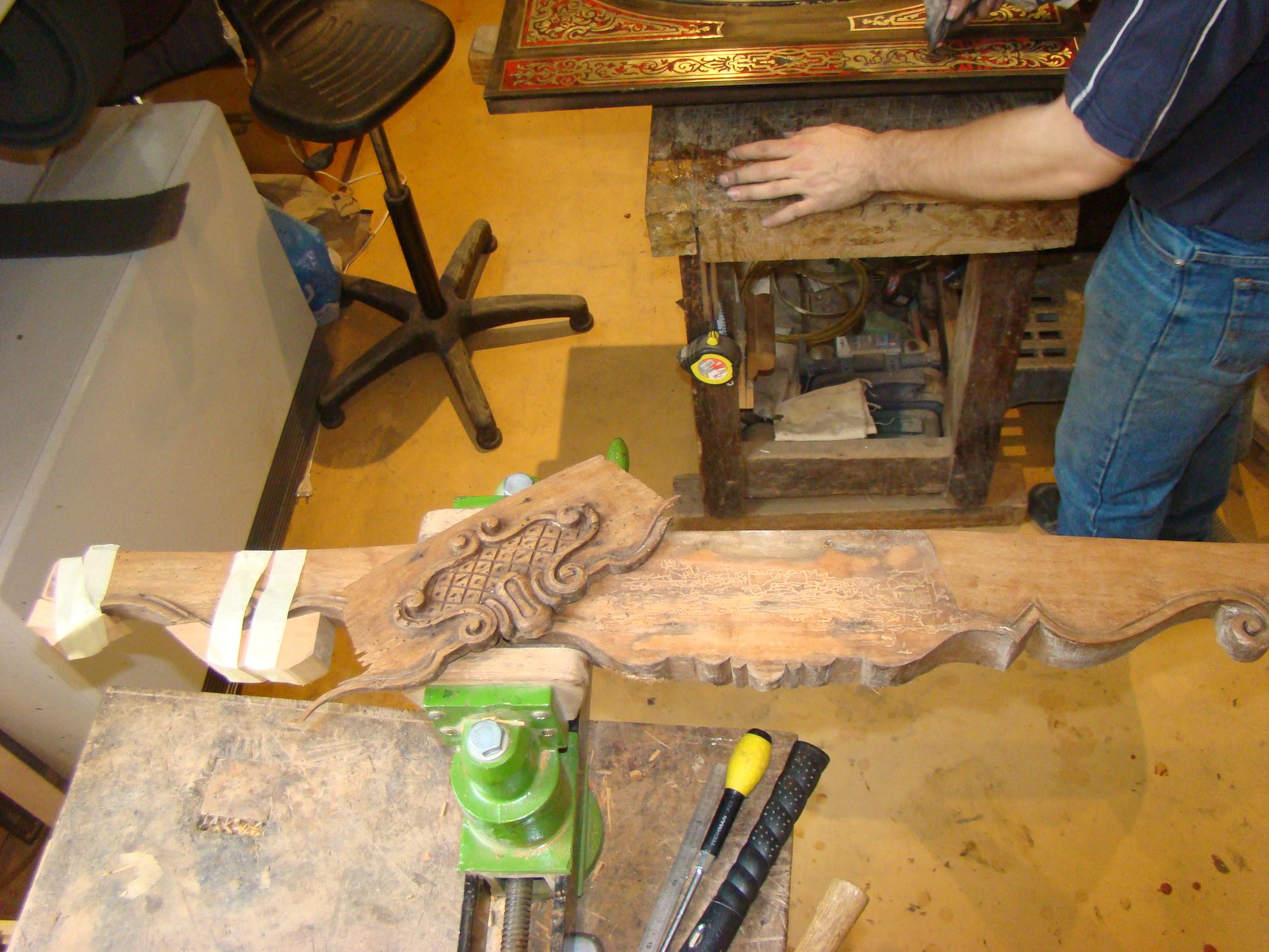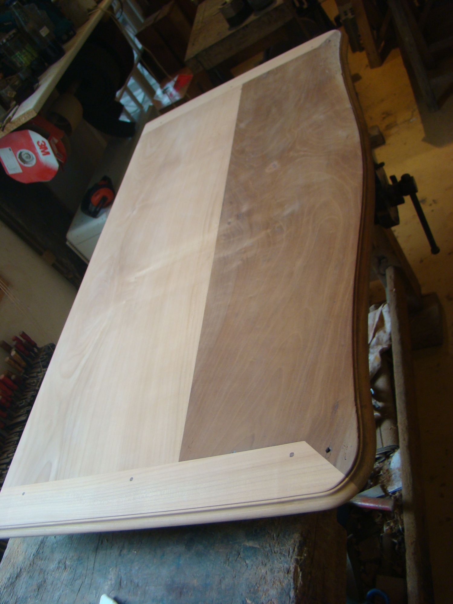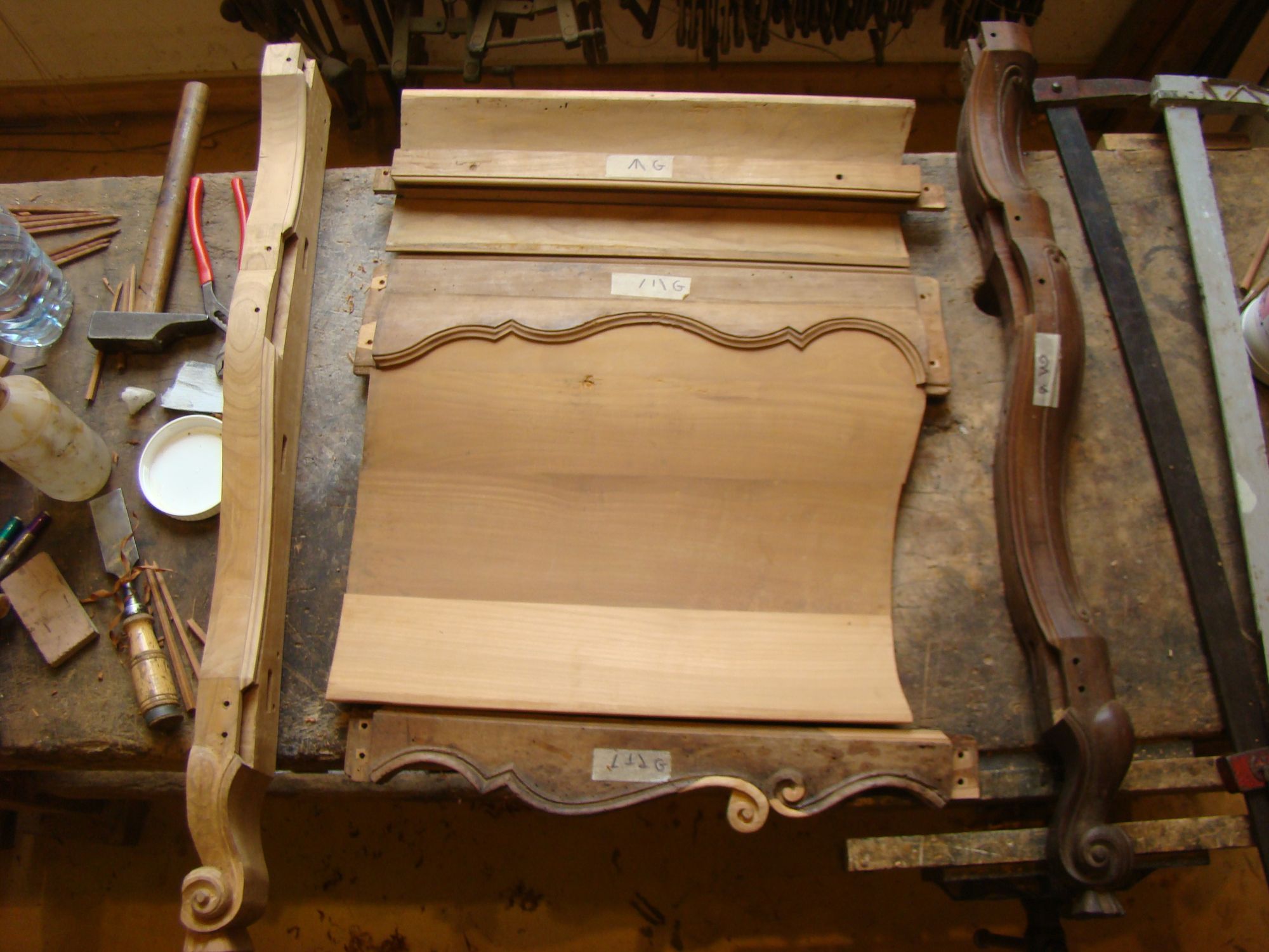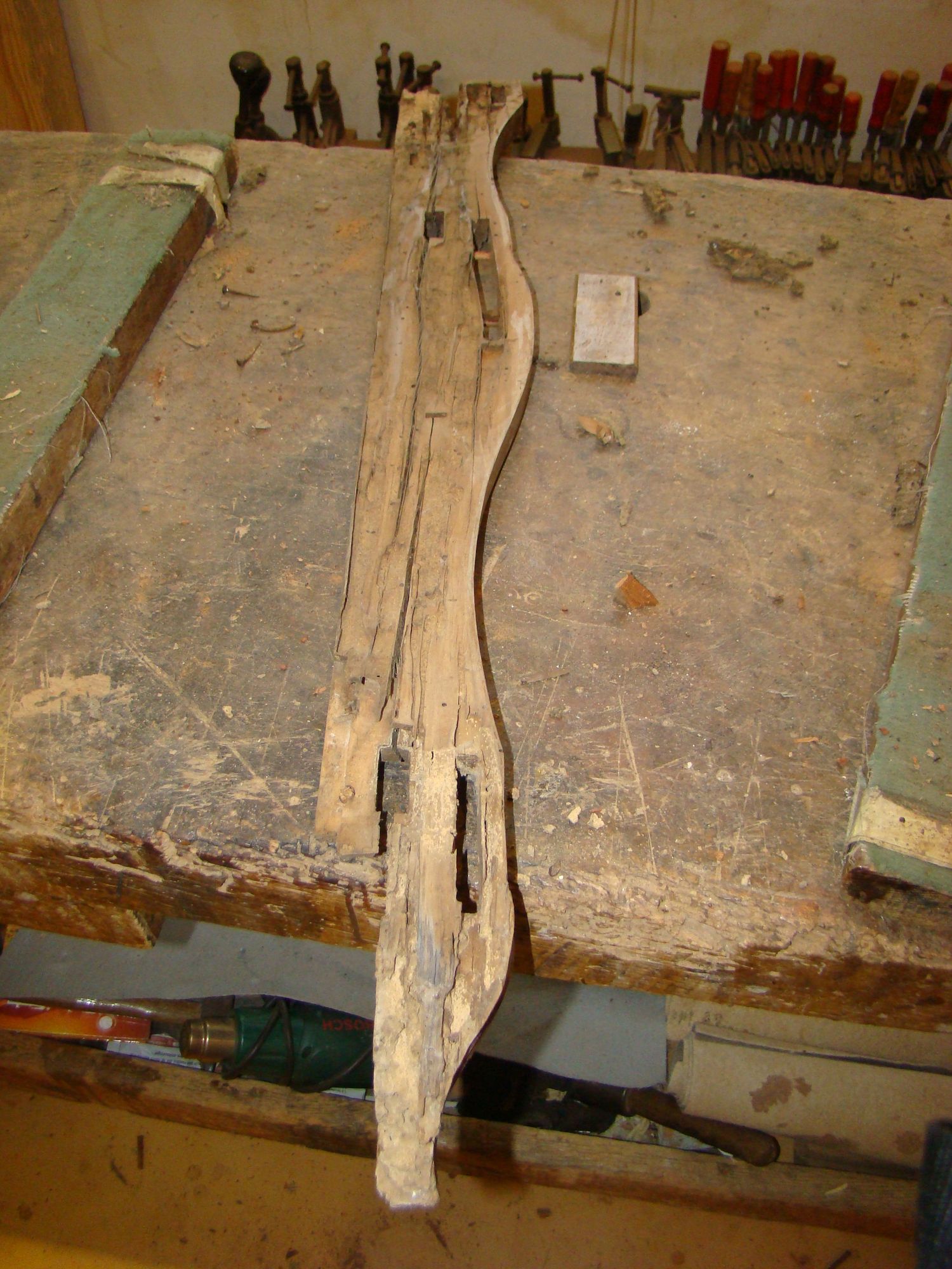 Restauration d'une commode Louis XV tombeau en merisier avec les montants avant en acajou ; des environs de La Rochelle. Cette commode, ayant séjourné dans une maison infestée de termites, a subi de nombreux dommages.