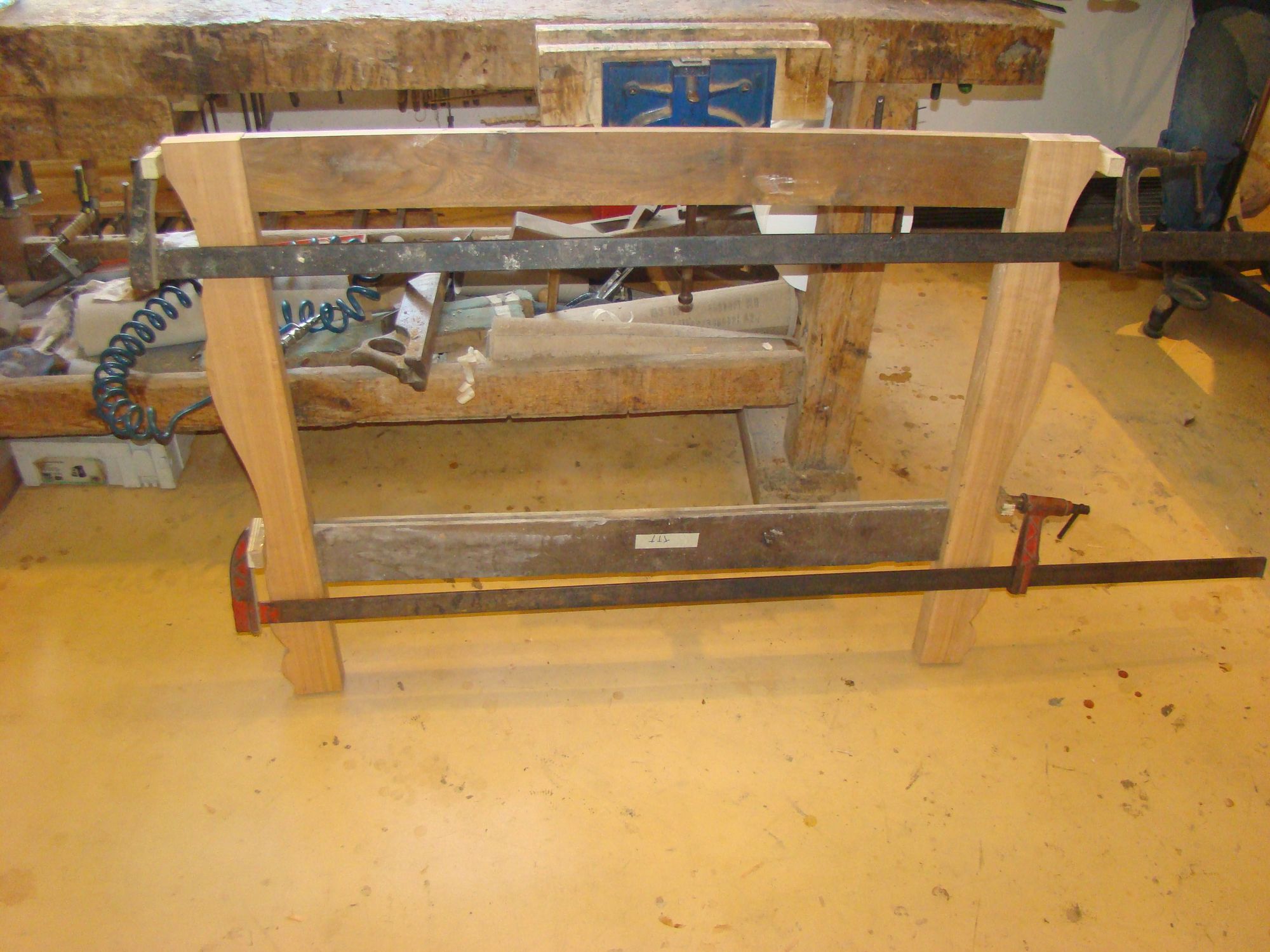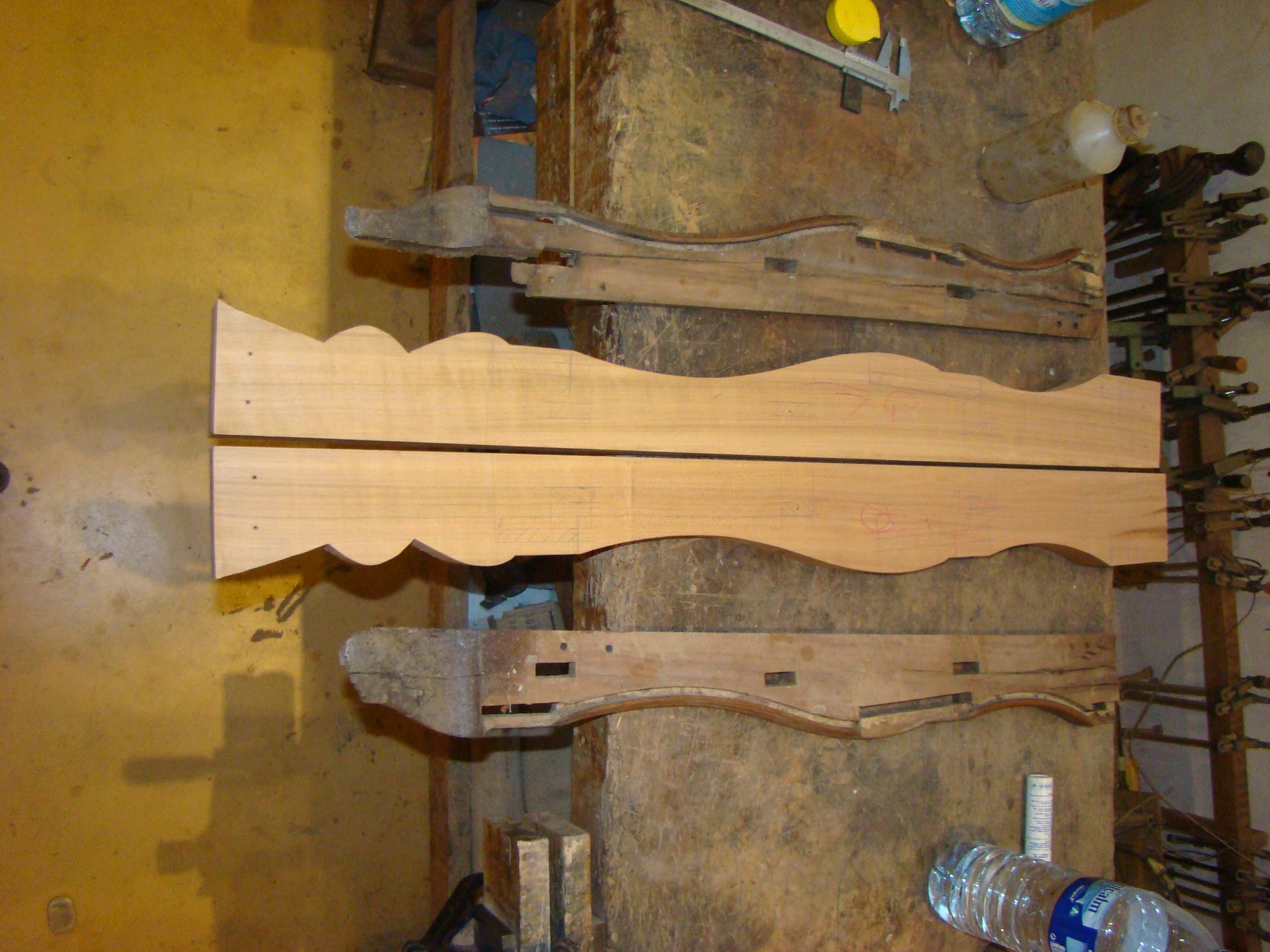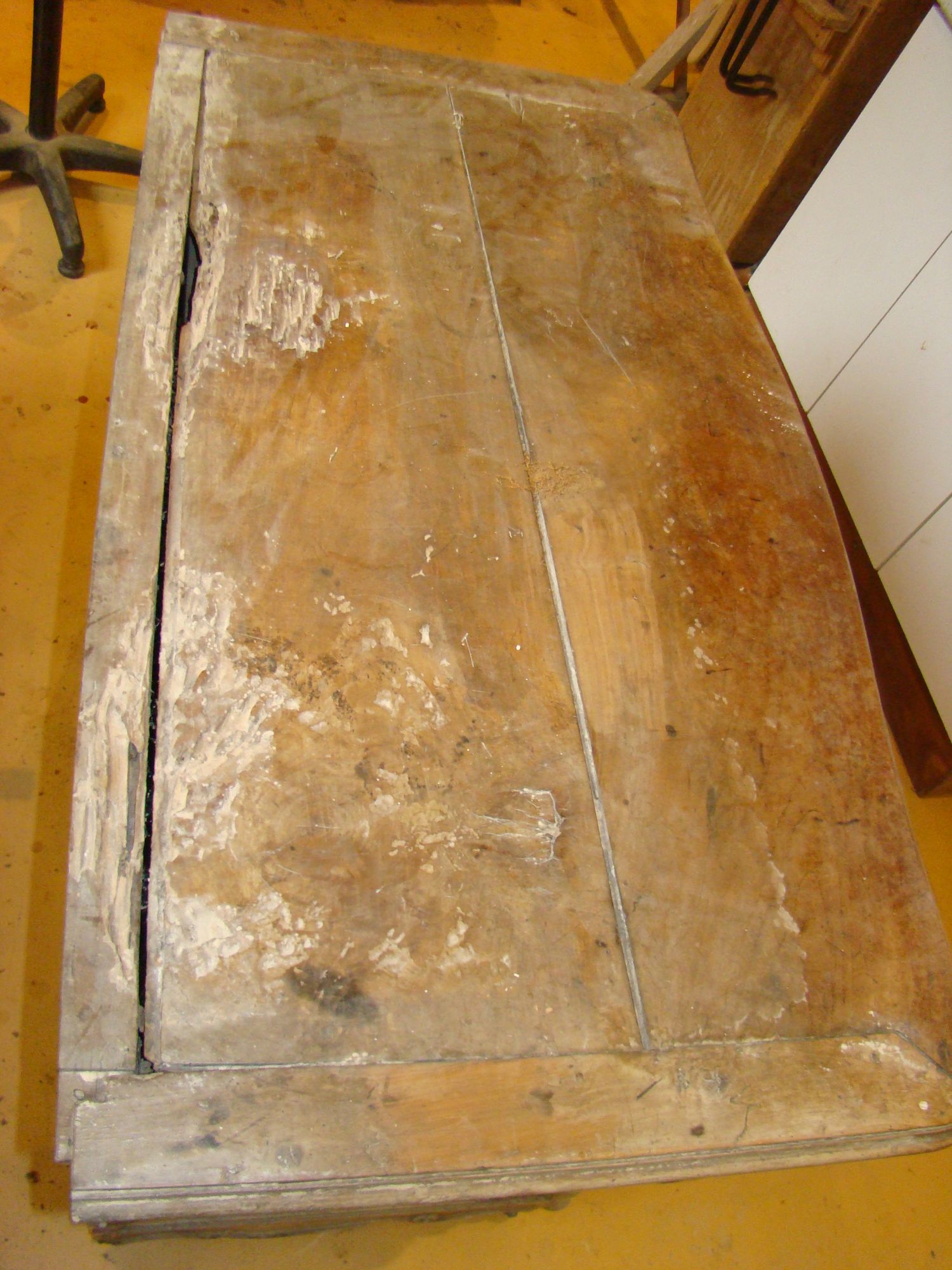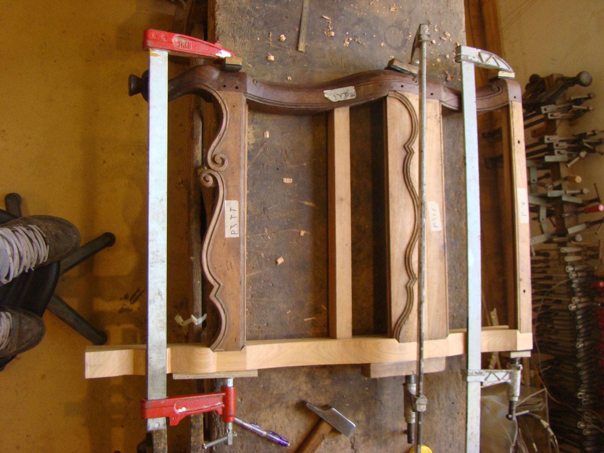 Restauration d'une commode Louis XV tombeau en merisier avec les montants avant en acajou ; des environs de La Rochelle. Cette commode, ayant séjourné dans une maison infestée de termites, a subi de nombreux dommages.