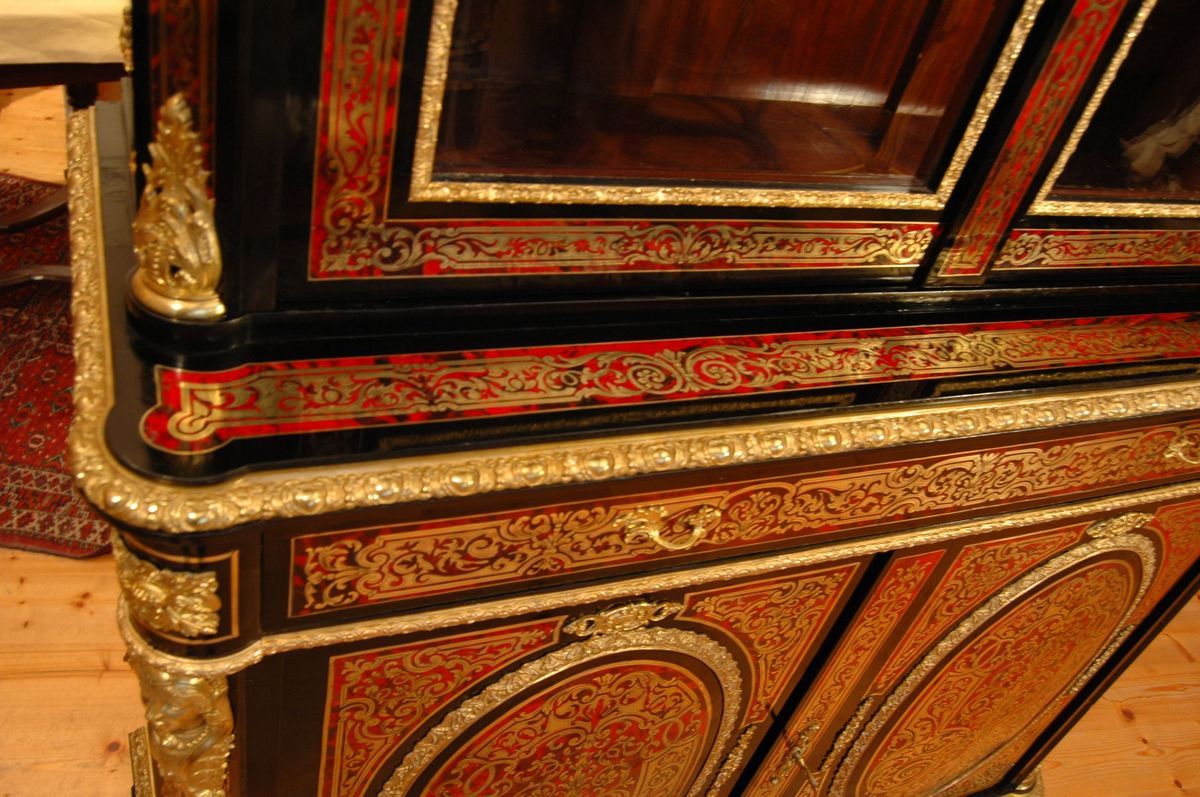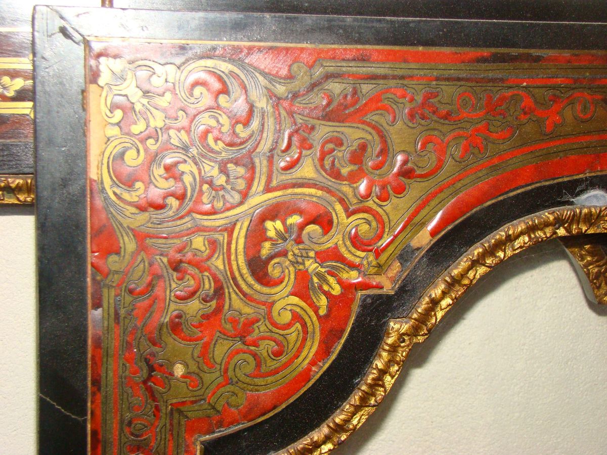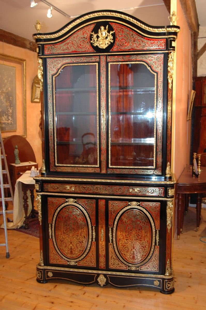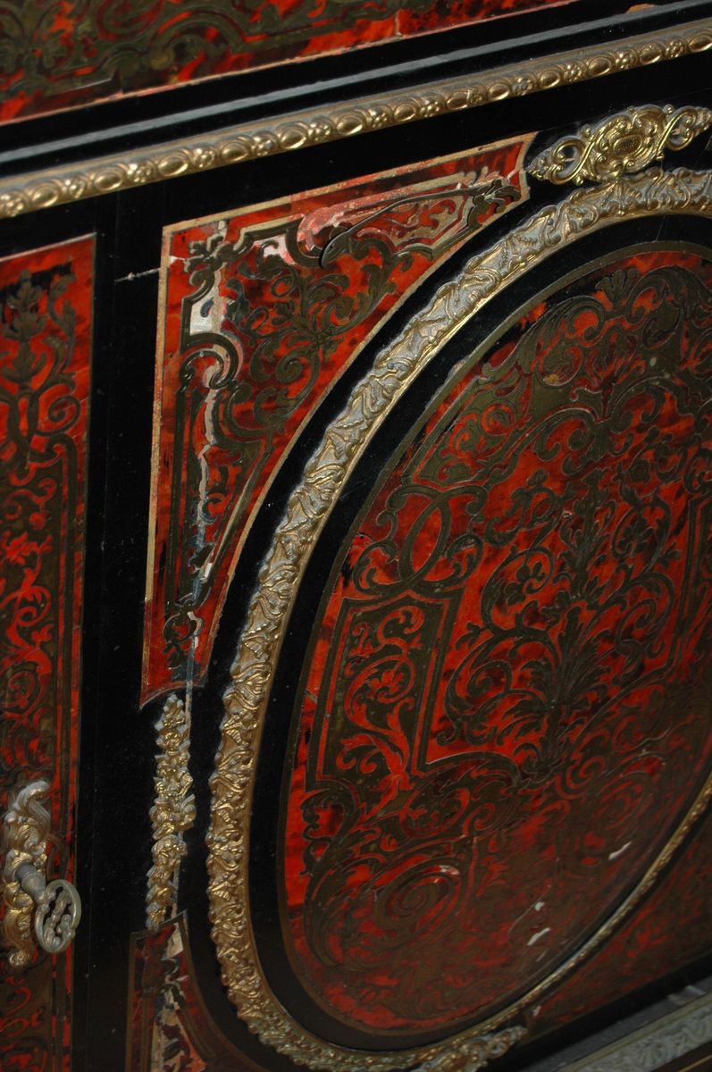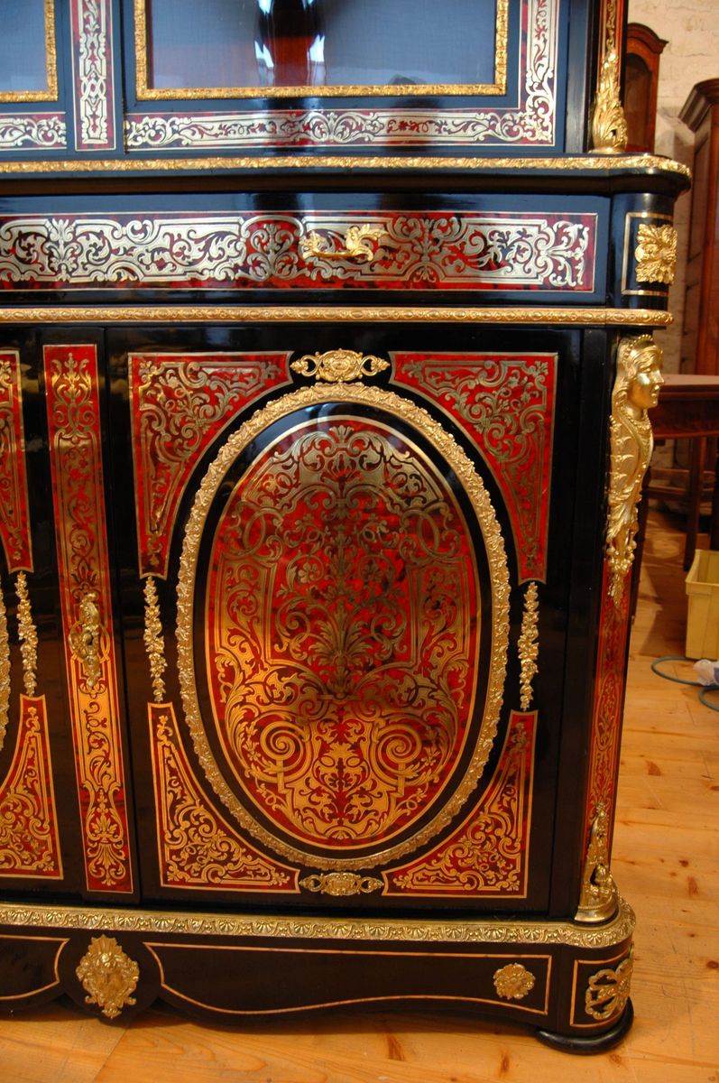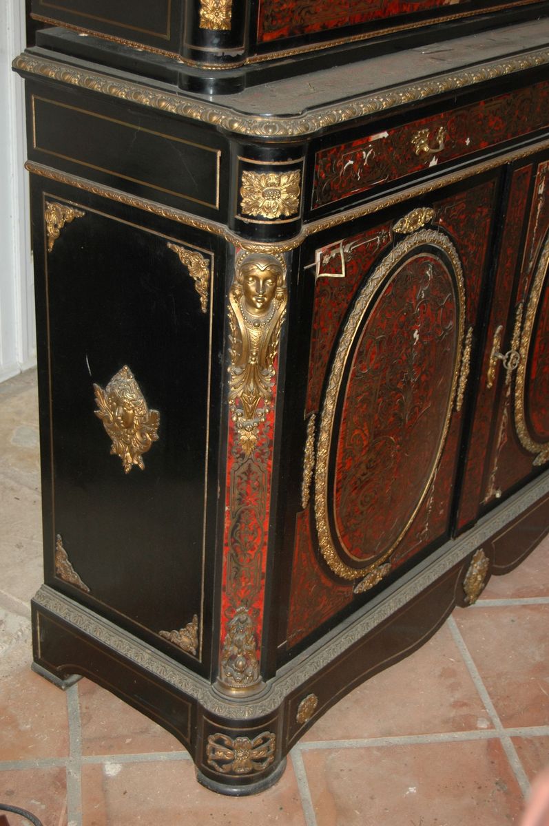 Buffet bibliothèque à deux corps de style Louis XV,d'époque Napoléon III marqueterie d'écaille sur fond rouge et laiton