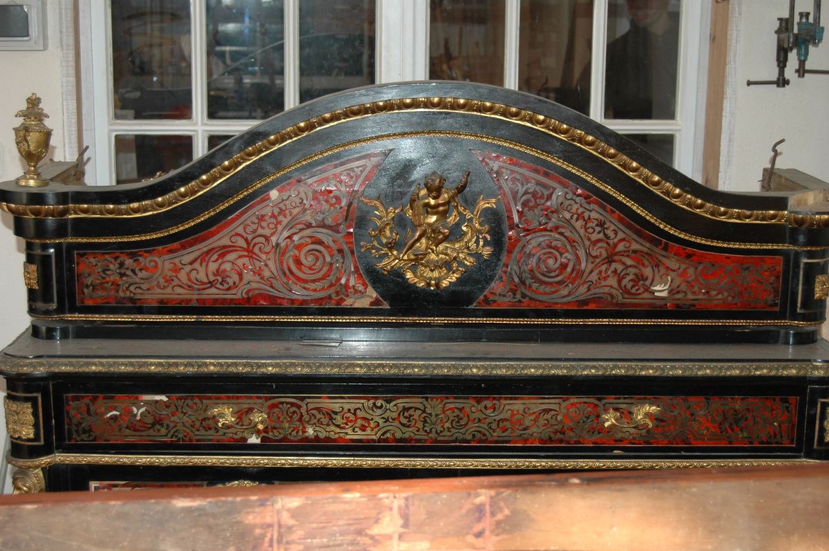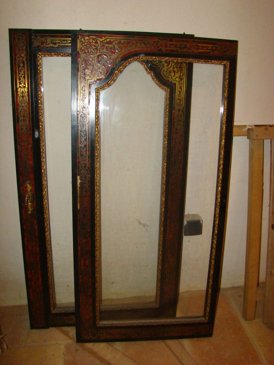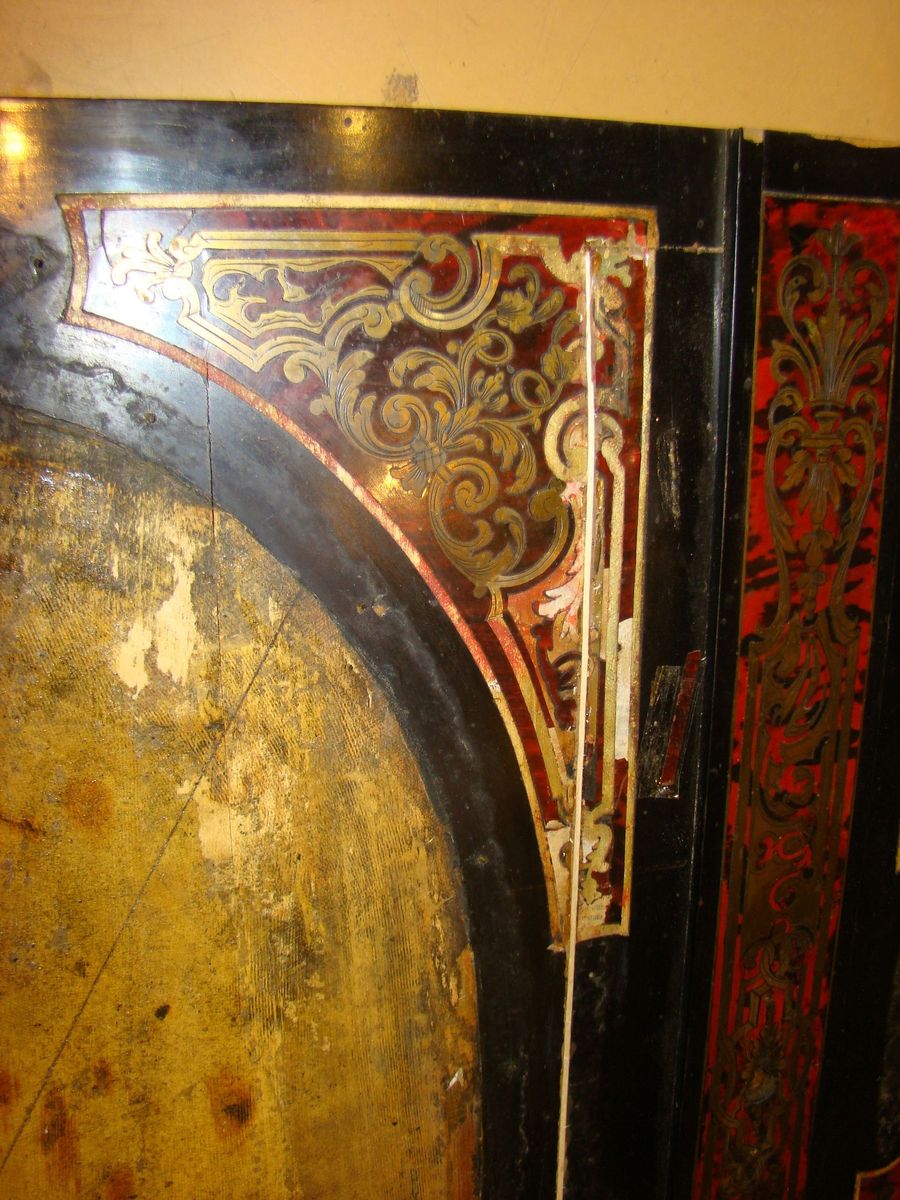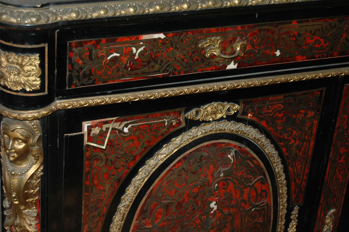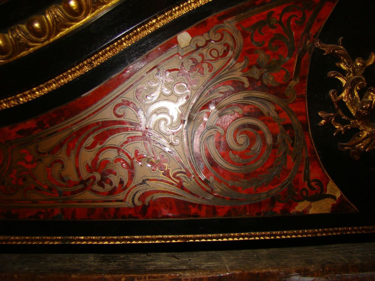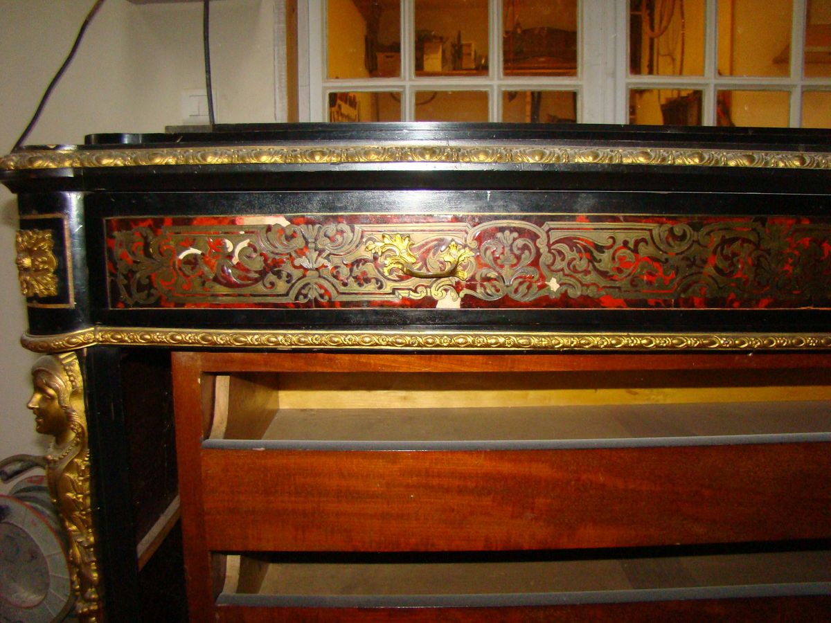 Buffet bibliothèque à deux corps de style Louis XV,d'époque Napoléon III marqueterie d'écaille sur fond rouge et laiton
